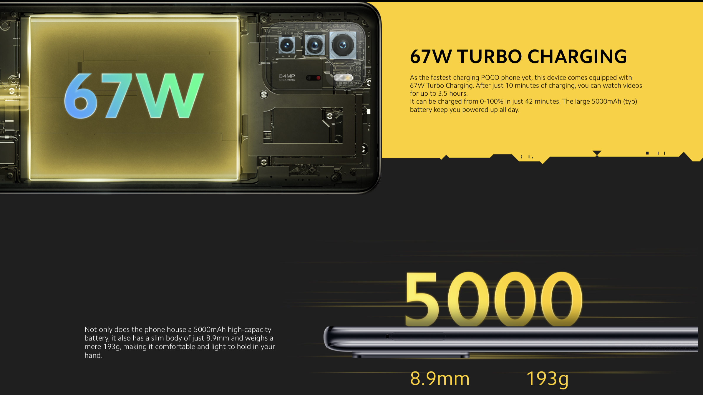 แบตเตอรี่ก็ให้มาเยอะ 5,000mAh แต่ที่ดีคือตัวเครื่องไม่ได้หนาและหนักมากเกินไป โดยความหนาจะอยู่ที่ 8.9 มม ส่วนน้ำหนักอยู่ที่ 193 กรัม ถือว่าทำออกมาได้ดีเลยทีเดียว นอกจากแบตจะเยอะแล้วเรื่องการชาร์จก็ยังจัดเต็ม โดยให้มาเป็น 67W TURBO CHARGING ชาร์จแบตเตอรี่ 0-100% ได้ในเวลา 42 นาทีเท่านั้น