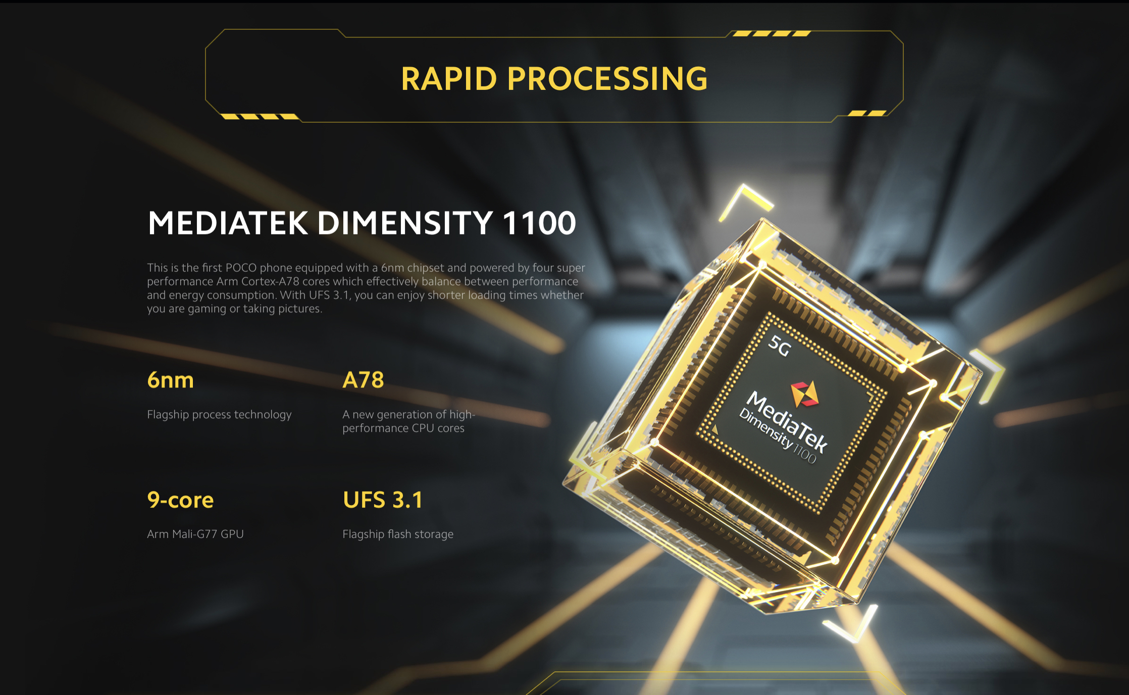 จุดเด่นของรุ่นนี้เลยคือให้สเปกที่จัดเต็ม และคุ้มค่ามาก ๆ คือตัวชิปประมวลผลให้เป็น MediaTek Dimensity 1100 เป็นชิปที่ผลิตบนสถาปัตยกรรม 6nm ตัว GPU จะเป็น Mali G77 MC9 ในเรื่องของการเชื่อมต่อรองรับ 5G และ Wi-Fi 6 แรม 8GB LPDDR4X และความจุเป็น + 256GB UFS 3.1