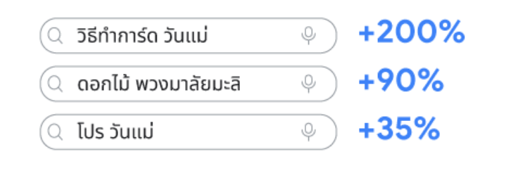 สิ่งที่ผู้คนนิยมมากขึ้นคือความสนใจในการค้นหาไอเดีย ของขวัญ และสิ่งต่างๆ ทางออนไลน์ โดย Google ได้รวบรวมข้อมูลและการวิเคราะห์ข้อมูลผ่าน Google Trends ซึ่งสะท้อนสิ่งที่คนไทยกำลังมองหาและต้องการในช่วงเทศกาลวันแม่ปีนี้ เพื่อเป็นประโยชน์สำหรับผู้ประกอบธุรกิจเพื่อช่วยให้คนไทยฉลองเทศกาลวันแม่ได้ดีที่สุด