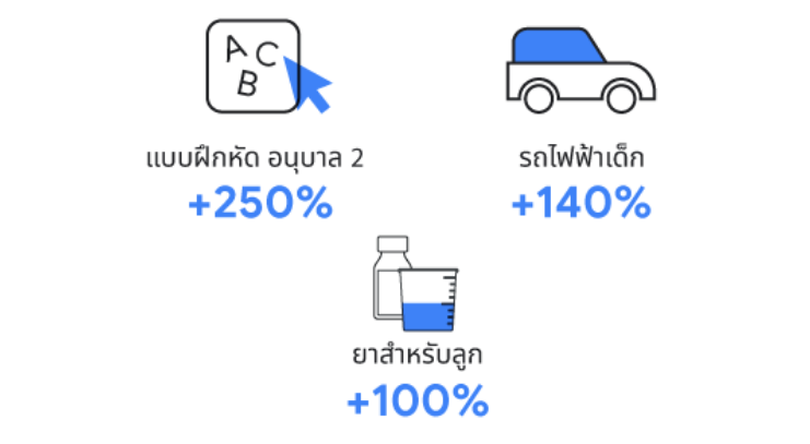โดยตัวเลขที่เพิ่มขึ้นสำหรับกลุ่มสินค้าเพื่อลูก เป็นตัวเลขระหว่างช่วงเดือนมกราคม – มิถุนายน 2654 เมื่อเปรียบเทียบกับช่วงเวลาเดียวกันเมื่อปีที่แล้ว นอกจากนี้ สามารถค้นหาบทความข้อมูลเชิงลึกผู้บริโภค กลยุทธ์ และเครื่องมือสำหรับนักการตลาดเพิ่มเติมได้ที่ https://www.thinkwithgoogle.com/th
