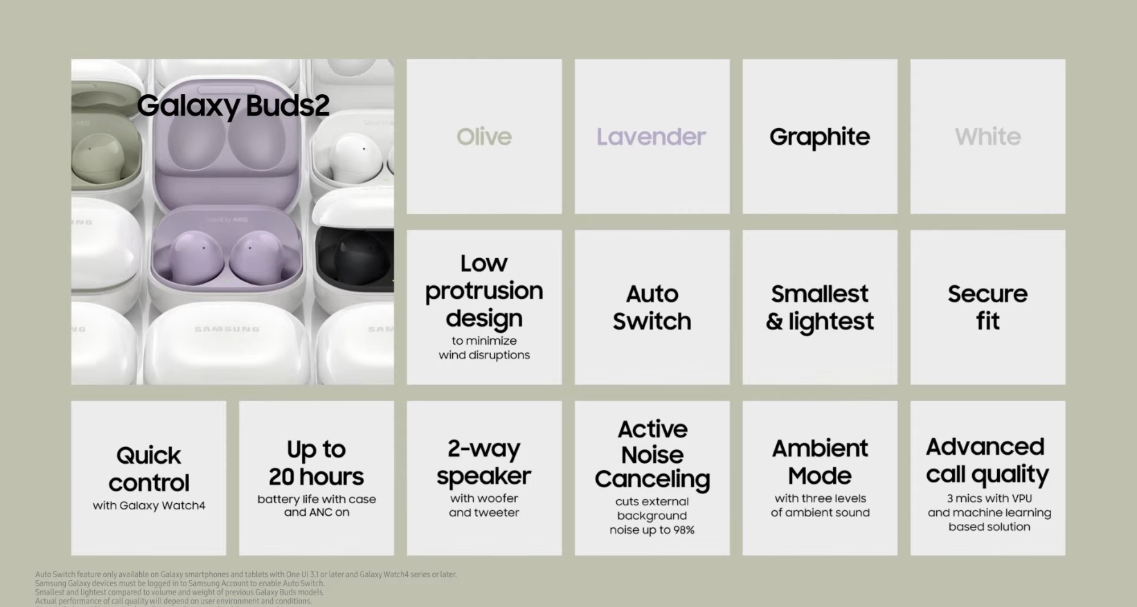 มีทั้งหมด 4 สี White, Graphite, Olive, Lavender (เคสข้างนอกจะเป็นสีขาวเสมอ เปลี่ยนสีแค่ภายในเคสกับตัวหูฟัง) ราคาเริ่มต้น $149.99