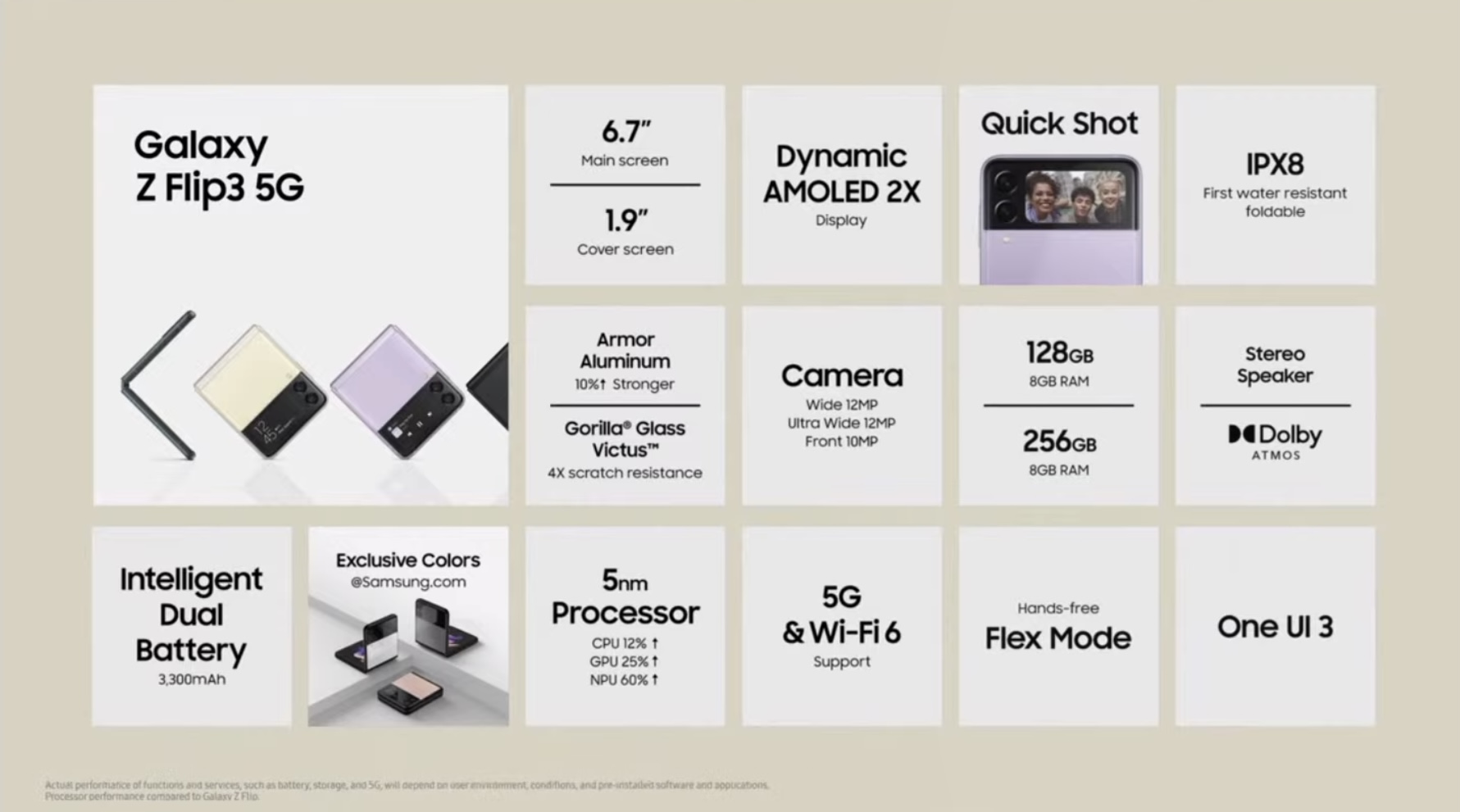 Galaxy Z Flip3 วางจำหน่ายในราคา 34,900 บาท (128GB) และ 36,900 บาท (256GB) มาในตัวเลือก 4 สีสุดโมเดิร์น ได้แก่ สีครีม, สีเขียว, สีม่วงลาเวนเดอร์ และ สีดำ Phantom Black โดยใน samsung.com จะมีสีพิเศษ White, Pink, Gray