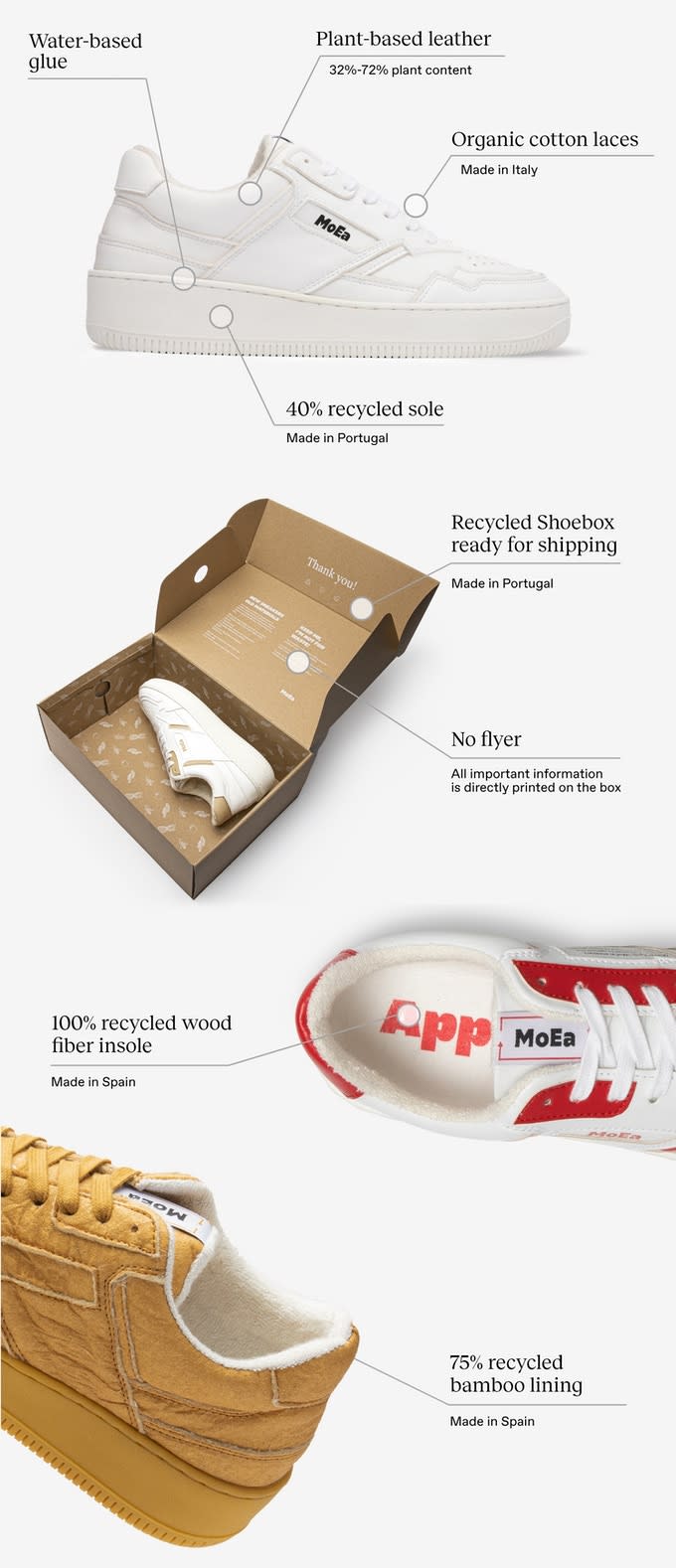 รองเท้าผ้าใบแต่ละคู่ของ MoEa จะประกอบไปด้วยพืชและผักผลไม้ประมาณ 49% ตามองค์ประกอบของตัวรองเท้า  พื้นรองเท้าด้านในทำจากเส้นใยไม้รีไซเคิล 100% นุ่มและสามารถระบายอากาศได้ ซับในอ่อนนุ่มของรองเท้า เป็นผ้าไม้ไผ่รีไซเคิล สามารถดูดซับความชื้นได้  ส่วนตัวรองเท้าด้านนอกสามารถทำจากหนังได้หลากหลายตามพืช ผัก  ที่ต้องการ โดยหนังแต่ละชิ้นจะถูกเย็บเข้าด้วยกันและติดกาวที่พื้นรองเท้าด้านนอกที่ทำจากยางรีไซเคิล เชือกรองเท้าทำขึ้นจากฝ้ายออร์แกนิก กล่องที่ใส่รองเท้าก็ยังทำจากกระดาษรีไซเคิล และไม่มีพลาสติกหรือกระดาษเสริมใด ๆ