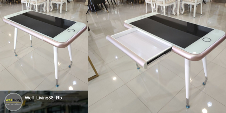 ชิ้นแรกเป็นโต๊ะรูปทรง iPhone มีสีให้เลือก 5 สี ชมพู,แดง,ทอง,น้ำเงิน,ดำ ด้านบนเป็นกระจกนิรภัย Temple ขาโต๊ะทำจากเหล็กชุบโครเมียมและชุบสีขาว ส่วนตัวโต๊ะทำจากอลูมิเนียม304 ไม่เป็นสนิม ขนาดโต๊ะ 105*52*75 cm มีให้เลือกหลายร้านราคาเริ่มต้นตัวนี้ถ้าเช็คในเวปจะอยู่ที่ประมาณ 6,900 บาทขึ้นไป