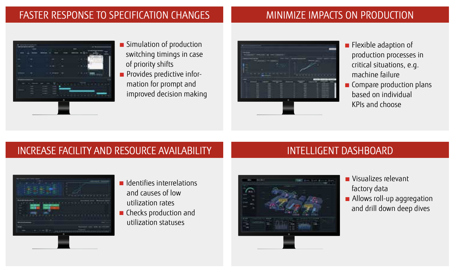 ระบบใหม่ดังกล่าวขับเคลื่อนโดยอาศัยโซลูชัน FUJITSU Manufacturing Industry Solution COLMINA Intelligent Dashboard(2) ที่คอยรวบรวม และประมวลข้อมูลการผลิตภายในโรงงาน โดยนำเสนอข้อมูลสถานะการผลิตที่ครอบคลุมมิติต่าง ๆ แบบเรียลไทม์ ความสามารถในการเชื่อมต่อเข้ากับสมาร์ทโฟน แท็บเล็ต รวมถึงอุปกรณ์อื่น ๆ ทำให้ผู้ใช้งานมองเห็นข้อมูลการดำเนินงานของทั้งโรงงาน และคุณภาพของผลิตภัณฑ์ที่เปลี่ยนแปลงไปได้ทุกที่ทุกเวลา นอกจากนี้ ระบบยังรองรับการบริหารโรงงานจากระยะไกล และการเข้าแทรกแซงอย่างรวดเร็ว เพื่อป้องกันไม่ให้การผลิตเกิดหยุดชะงัก และมีคุณภาพต่ำกว่ามาตรฐาน