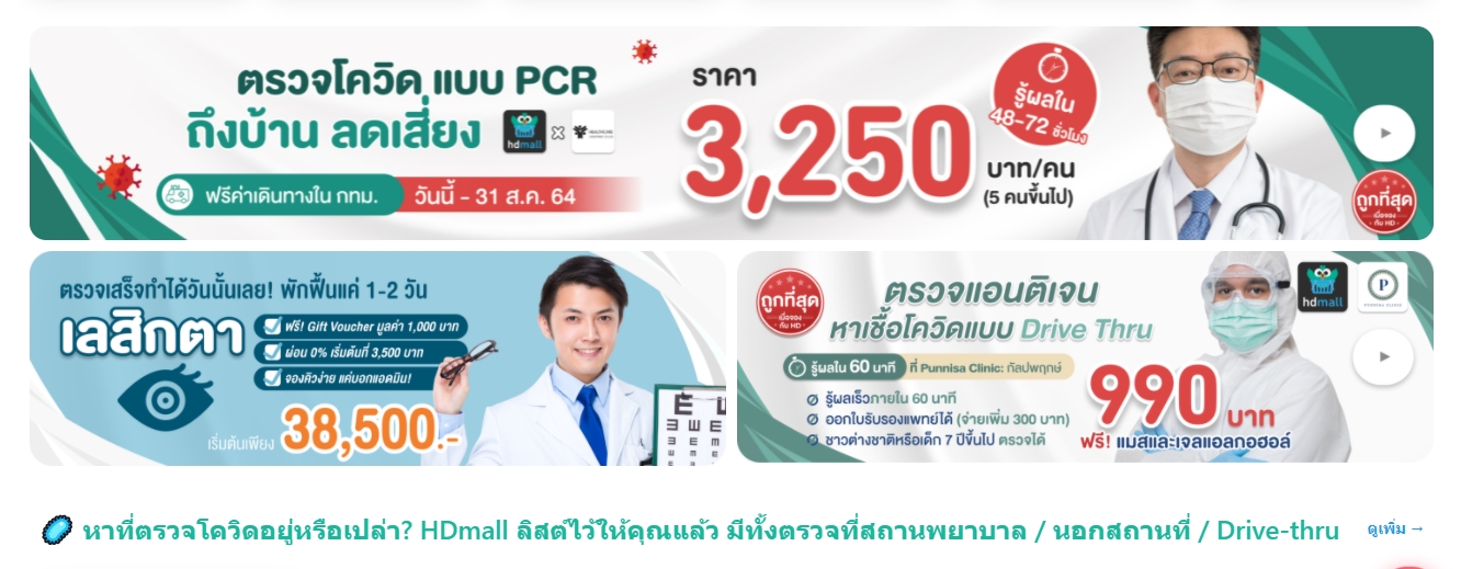 หรือใครที่กำลังหาที่ตรวจโควิดแบบ PCR หรือแบบ Rapid Antigen Test ก็สามารถเข้ามาดูใน HD mall ได้เช่นกันโดยแพ็กเกจทั้งหมดจะอัปเดตใหม่ทุกสัปดาห์ รวมแพ็กเกจสุขภาพ ความงาม ทำฟัน จากคลินิกและโรงพยาบาลต่างๆกว่า100แห่ง