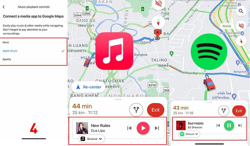 วิธีทำ: เข้าไปที่ Google Map Setting > Navigation > Music playback control >เลือกบริการ streaming (Apple, Spotify)
