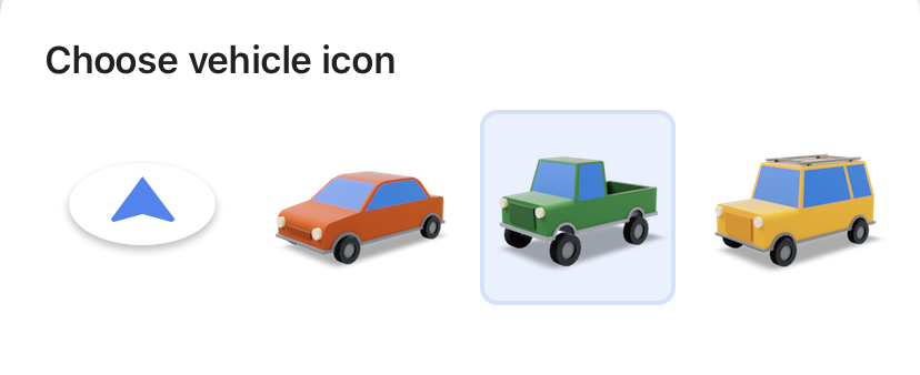 ถ้าเบื่อลูกศรนำทางแบบเดิมๆแล้วหละก็ ลองเปลี่ยนเป็นรูปรถดู โดยในแอพลิเคชันจะมีให้เลือกสามคัน คือ รถเก๋งสีแดง รถกระบะสีเขียว รถคันใหญ่สีเหลือง นอกจากนั้นจะมีไอคอนพิเศษในบางโอกาสบ้างเช่น Mario Day ก็มีไอคอนมาริโอ้ให้เลือกเล่นกัน