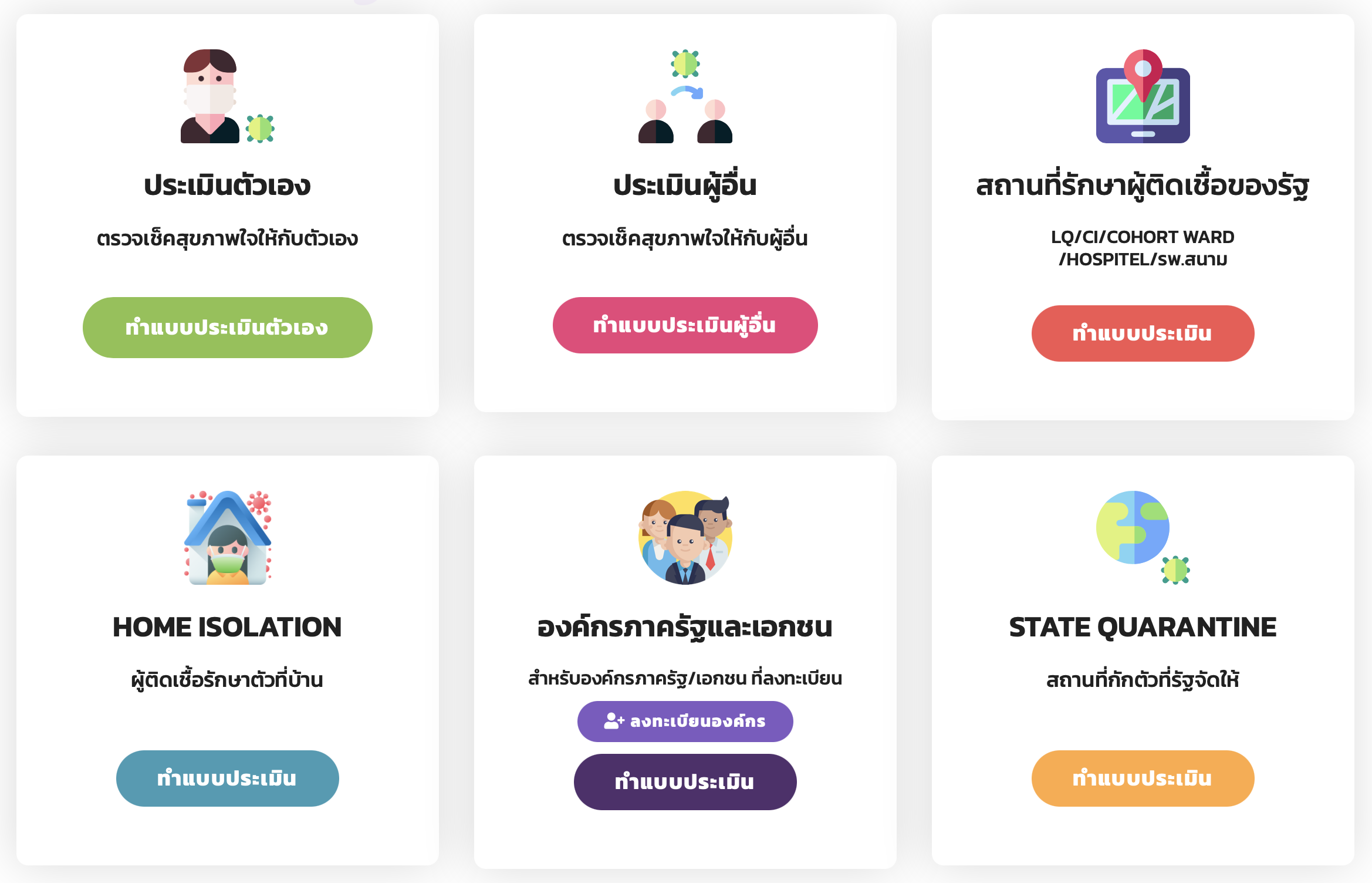 และมีการประเมินให้เลือกหลากหลาย ไม่ว่าจะเป็นการประเมินตนเอง, ประเมินผู้อื่น, สถานที่รักษาผู้ติดเชื้อจากรัฐ, Home Isolation, องค์กรภาครัฐและเอกชน และ State Quaratine