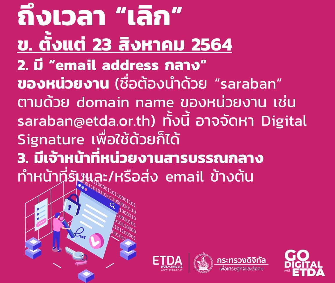 ตั้งแต่วันที่ 23 สิงหาคม 2564 จะเป็นเฟสแรกของภาครัฐจะเลิกใช้กระดาษและหันมาใช้การทำงานด้วยวิธีการทางอิเล็กทรอนิกส์เท่านั้น เริ่มด้วยระบบอีเมลและระบบสารบรรณอิเล็กทรอนิกส์ ต้องปรับตัวอะไรบ้าง?