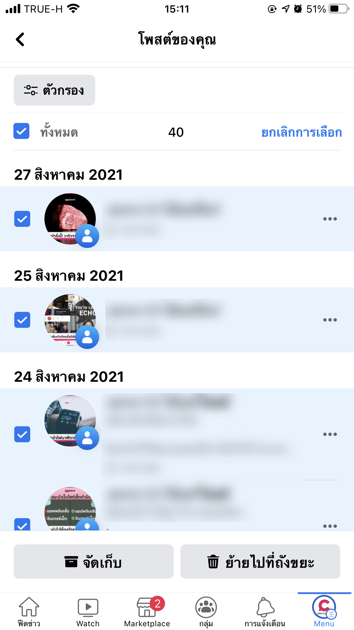 4.ทีนี้เราก็สามารถเลือกลบโพสต์ที่ต้องการได้เลย แค่ติ๊กเครื่องหมายถูกที่น่าช่องโพสต์นั้น ๆ หรือจะเลือกลบทั้งหมดก็ได้