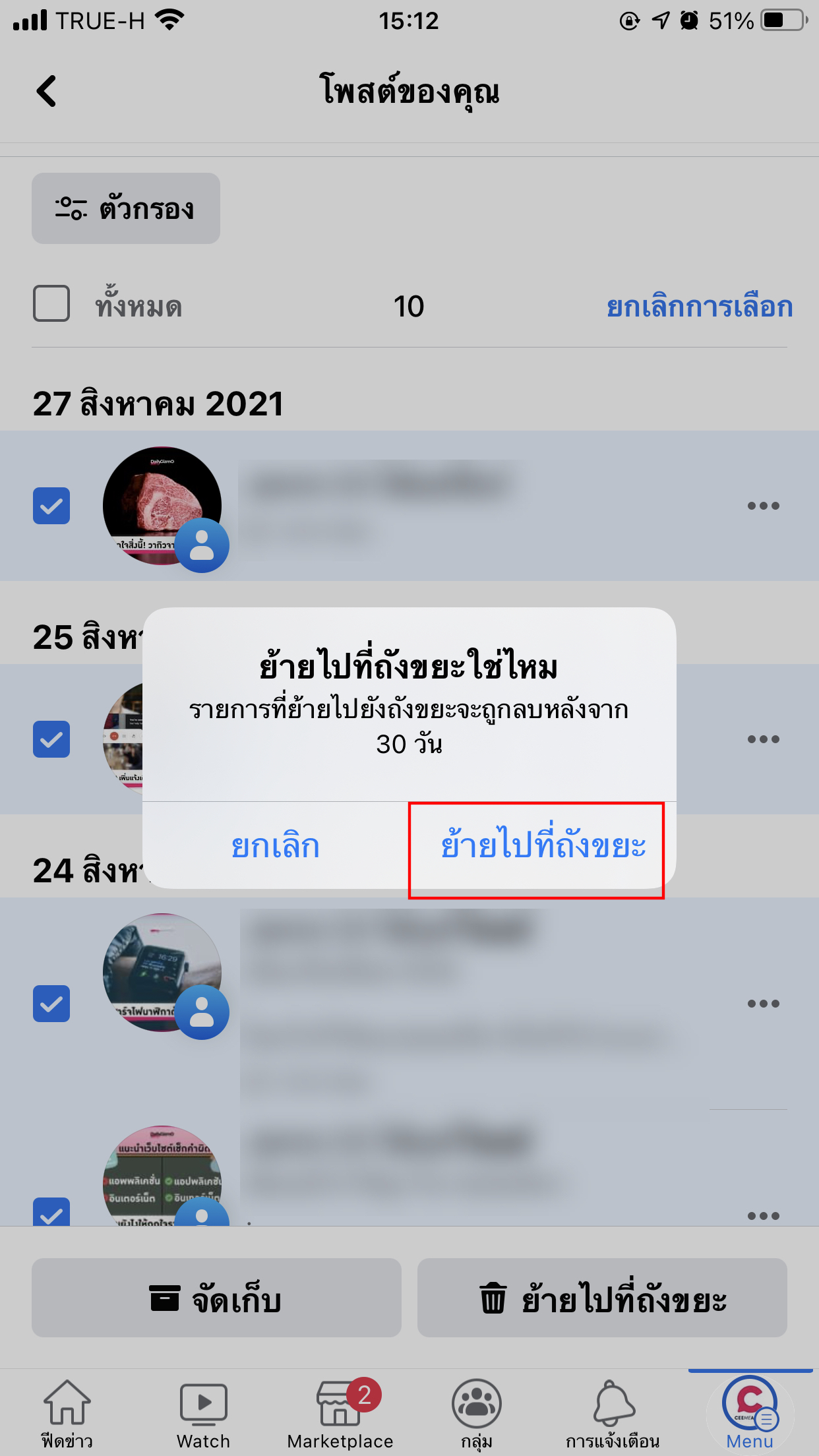 5.แล้วเลือก “ย้ายไปที่ถังขยะ” แค่นี้โพสต์ก็หายเกลี้ยงในครั้งเดียว