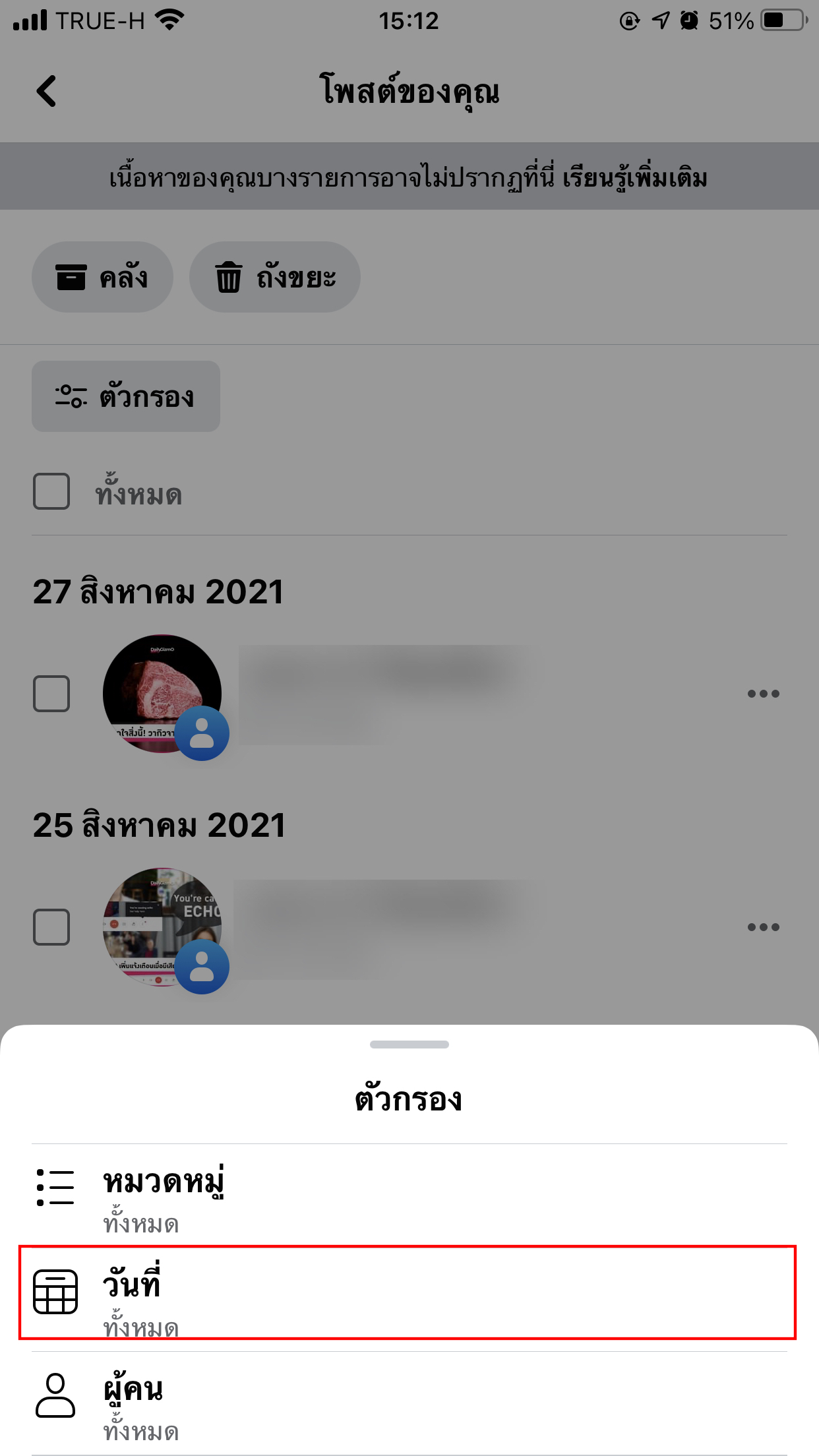 6.หรือจะเลือกดูช่วงเวลาของโพสต์ในอดีตก็ได้ แค่ไปที่ “ตัวกรอง” แล้วเลือก “วันที่”