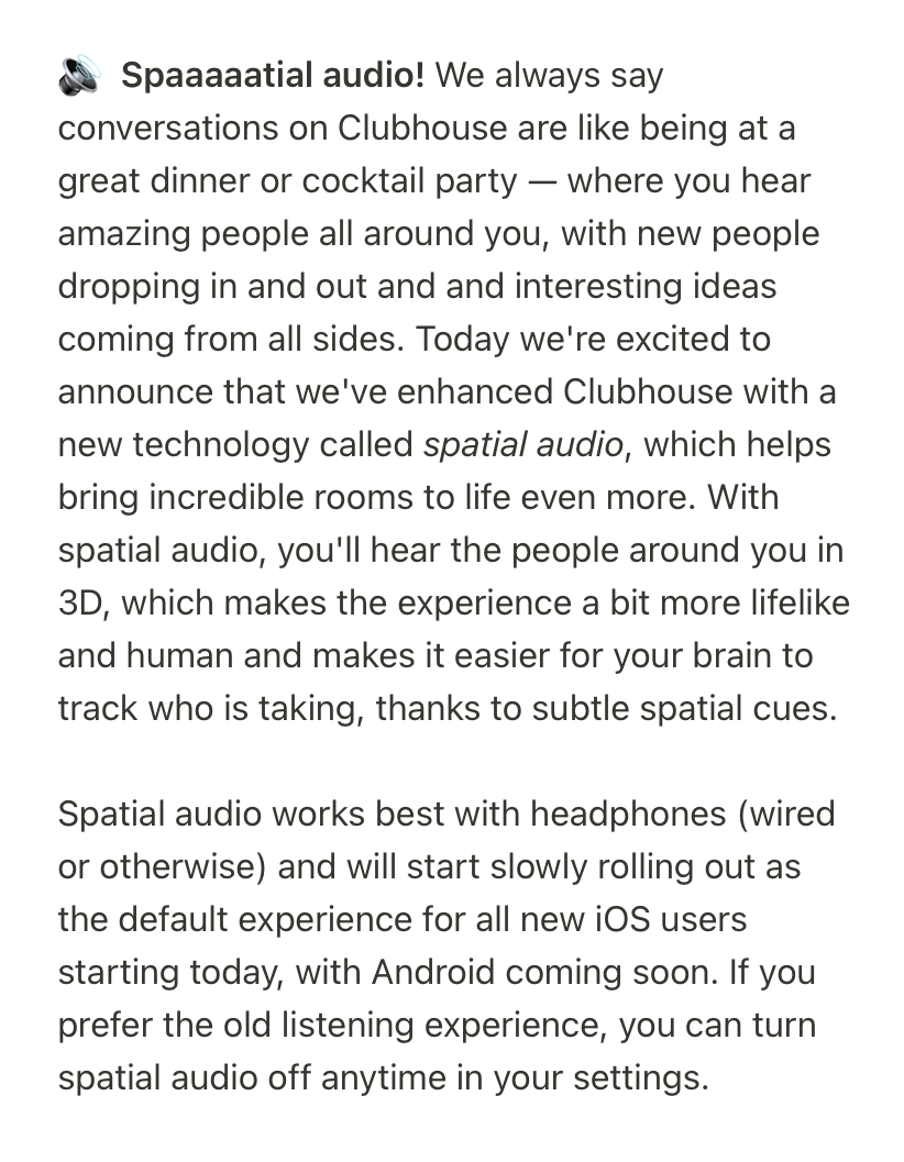 Justin Uberti แห่ง Clubhouse เปิดเผยว่า “สิ่งหนึ่งที่คำนึงถึงคือ กลุ่มผู้ฟังไม่ได้รับประสบการณ์แบบเดียวกับการอยู่ในพื้นที่จริงๆ” เช่นการพูดคุยใน clubhose เป็นเหมือนกับการพูดคุยกันในงานเลี้ยง ซึ่งจะมีผู้คนรอบๆตัว มีทั้งคนเข้าและออกไปๆมาๆรอบตัวเรา ให้ห้องมีชีวิตชีวามากขึ้นด้วย Spatial Audio ที่จะได้ยินเสียงแบบ 3 มิติ ซึ่งหากจะสัมผัสประสบการณ์ได้เต็มที่ แนะนำว่าต้องใส่หูฟังด้วย โดยประกาศในแอป clubhouse จะเริ่มใช้งานใน iOS ก่อน และตามด้วยทางฝั่ง Android