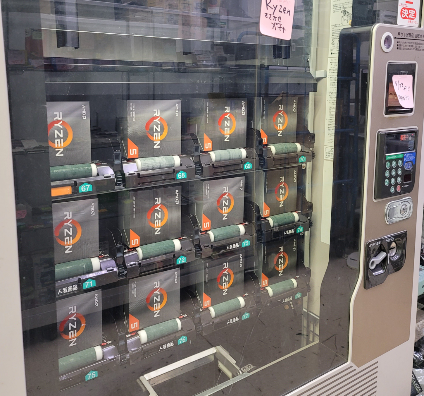 ภาพนี้มาจากผู้ใช้ทวิตเตอร์ชื่อว่า @Nullpo_x3100นำภาพของตู้ขายของอัตโนมัติ ภายในมีกล่องของซีพียูหลายรุ่น ซึ่งหลักๆจะเป็นกล่องของ Ryzen 5 5600X. ซึ่งตู้นี้เริ่มให้บริการมาตั้งแต่ 28 สิงหาคมที่ผ่านมา
