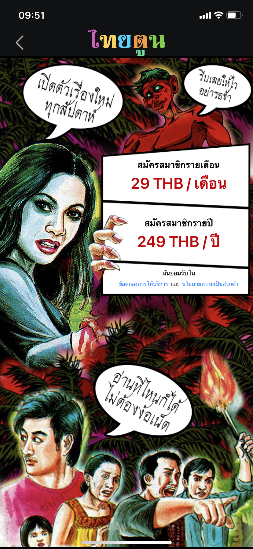 Thaitoon ดาวน์โหลดฟรีได้เฉพาะฝั่ง IOS สามารถล็อกอินได้โดยใช้อีเมล / เฟชบุ๊ก / Apple ID เมื่อเข้าไปภายในแอปฯ จะมีหลายหมวดหมู่เช่น อ่านฟรี / แนะนำ / นิยมขณะนี้ / ใหม่ล่าสุด / แผงหนังสือ มีให้เลือกทั้งอ่านฟรีและเสียค่าสมาชิก