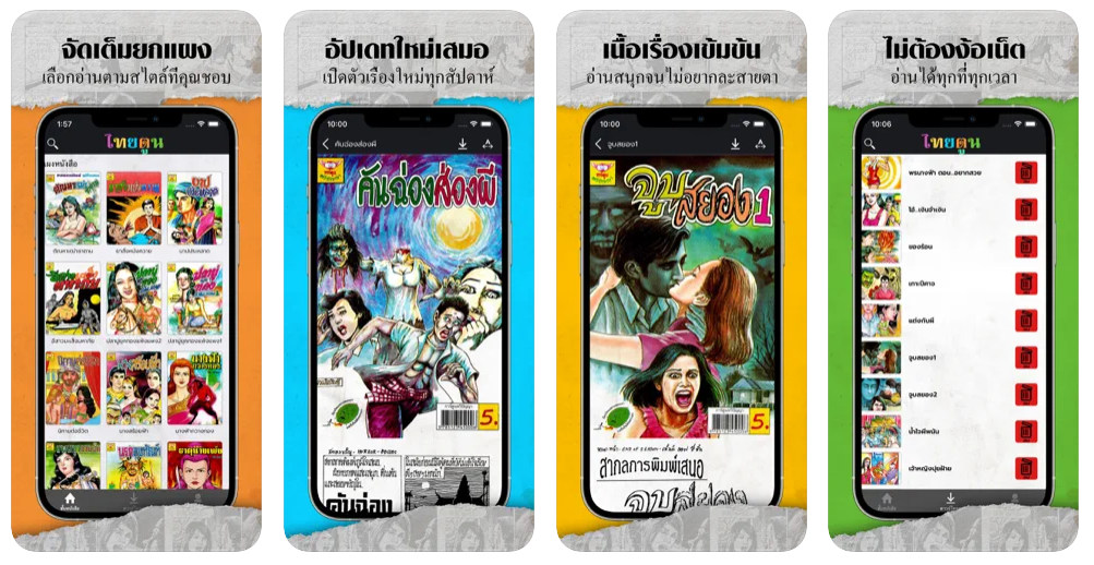 ThaiToon แอปอ่านการ์ตูนยุคคลาสสิคเพื่อแฟนการ์ตูนไทยยุคก่อนโดยเฉพาะ ให้ผู้อ่านได้สัมผัสกับความรู้สึกเก่าๆอีกครั้ง มาในรูปแบบโฉมใหม่ในโลกออนไลน์ที่ง่ายต่อการอ่านมากขึ้น มีให้เลือกหลากหลายแนวทั้งสยองขวัญ ผจญภัย ชิงรักหักสวาท รวมไปถึงนิยายพื้นบ้านก็มีเหมือนกัน