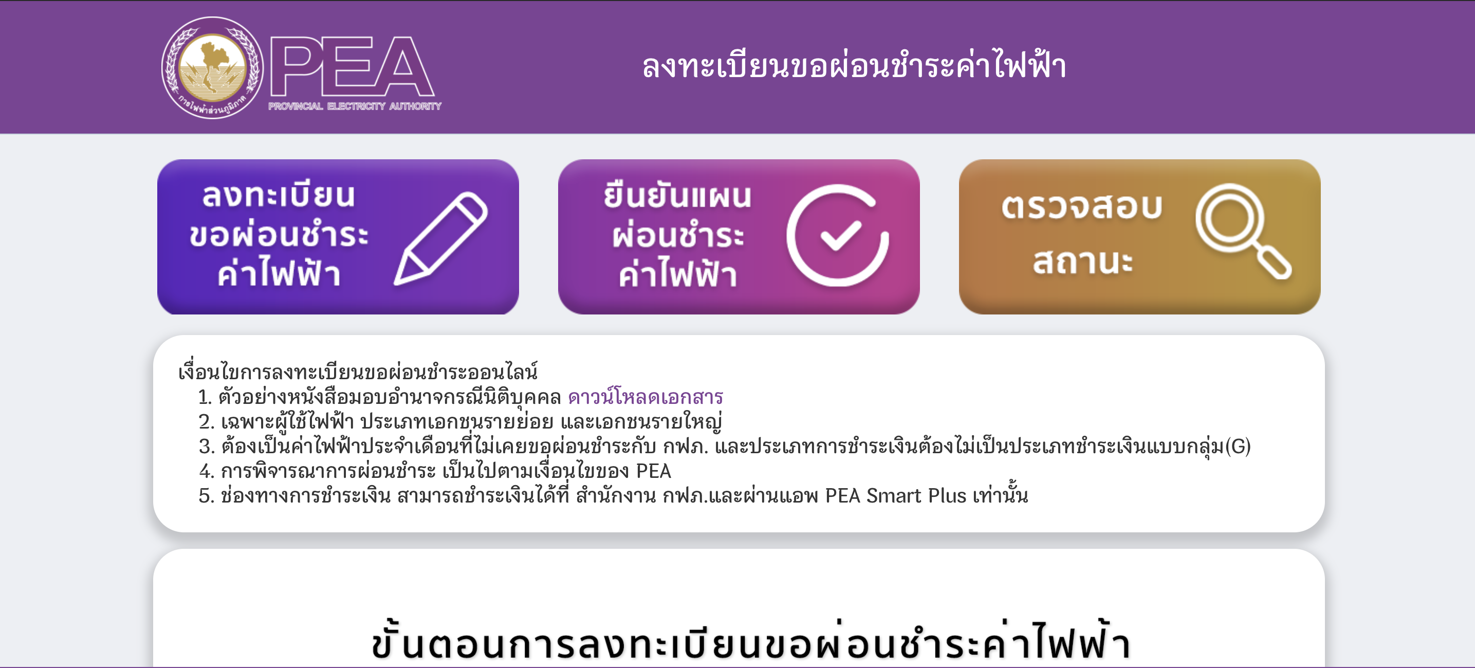 ใครที่ประสบปัญหาเรื่องการเงินในสถานการณ์โควิด ตอนนี้การไฟฟ้าส่วนภูมิภาค (PEA) ช่วยบรรเทาความเดือดร้อนผู้ใช้ไฟฟ้าที่ได้รับผลกระทบจากสถานการณ์โควิด เปิดให้ผู้ใช้ไฟฟ้าสามารถลงทะเบียนขอผ่อนชำระค่าไฟฟ้าผ่านระบบออนไลน์