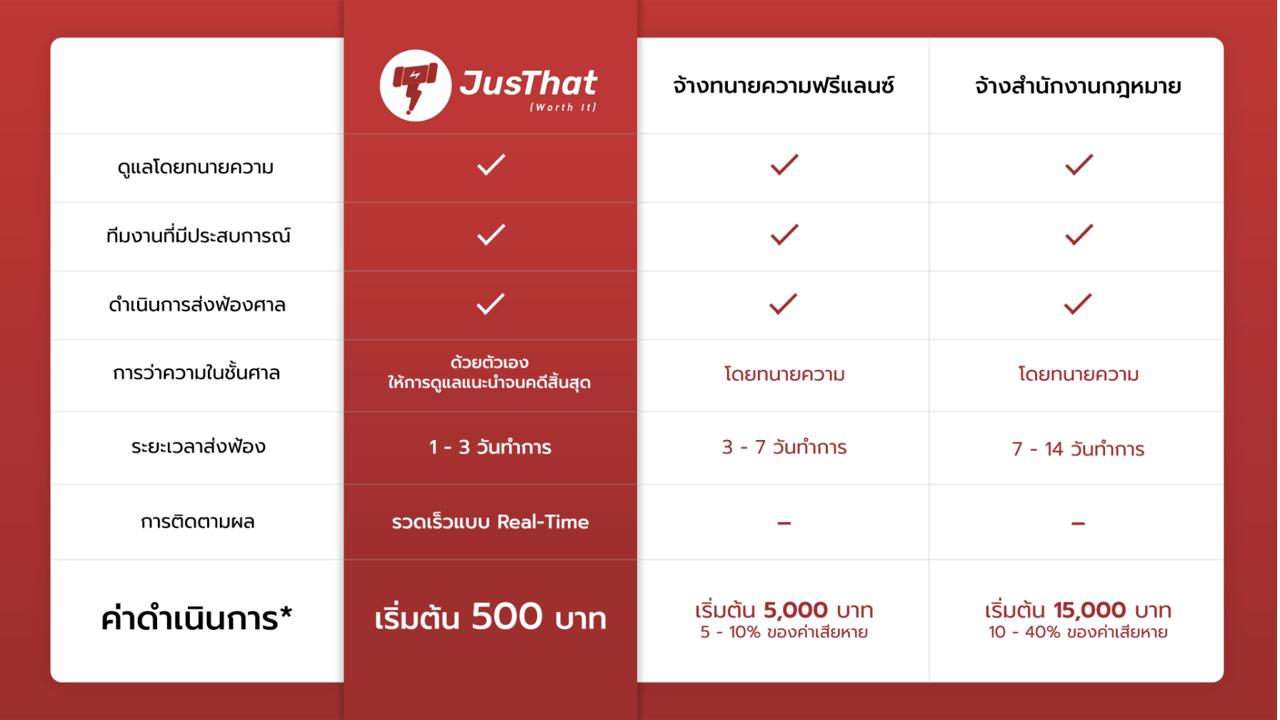 เรื่องขึ้นโรงขึ้นศาลเป็นเรื่องน่าปวดหัว อยากฟ้องศาลคดีเล็กๆ แต่กลัวจ้างทนายแล้วไม่คุ้มค่าใช้จ่าย ขอแนะนำแอป JusThat แอปปรึกษาทนายออนไลน์ ประเมินโอกาสชนะและความคุ้มค่าในการฟ้องจากรูปคดีและหลักฐาน รู้ผลใน 5 นาที โดยไม่เสียค่าใช้จ่าย! หากตัดสินใจฟ้องผ่านแอป ค่าใช้จ่ายเริ่มต้นแค่ 500 บาท