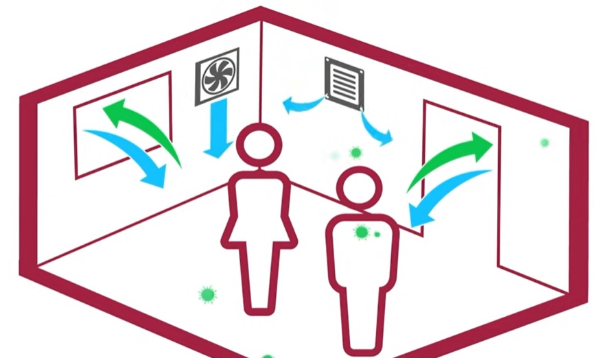 หลักการง่าย ๆ นี้ก็เพื่อลดความเข้มข้นของเชื้อไวรัสที่ฟุ้งกระจายอยู่ในพื้นที่ ซึ่งวิธีนี้ทำได้ไม่ยาก หากเป็นอาคารขนาดเล็กหรือห้องที่มีประตูหน้าต่างเยอะและไม่มีระบบปรับอากาศ เราสามารถเพิ่มอัตราการระบายอากาศได้ไม่ยากด้วยการเปิดประตูหน้าต่าง ติดตั้งพัดลมดูดอากาศ เป็นต้น ซึ่งจะช่วยได้มากน้อยแค่ไหนนั้นก็ขึ้นอยู่กับอัตราการระบายอากาศ