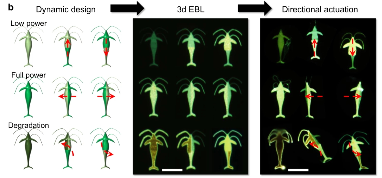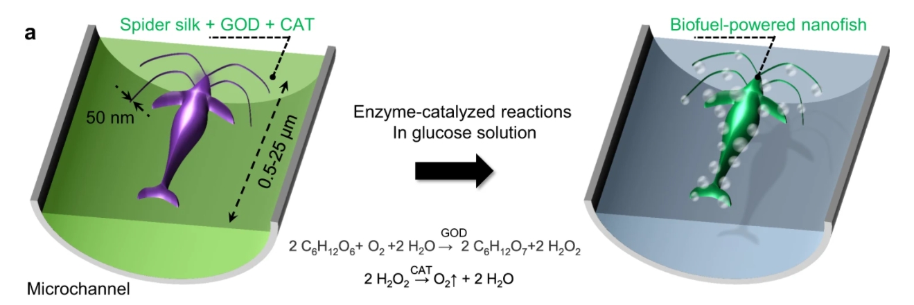 หุ่นยนต์ปลานาโนตัวนี้ ยังอยู่ในรูปแบบของโครงสร้าง 3 มิติ ซึ่งพัฒนามาจากโปรตีนของใยแมงมุมที่ละเอียดถึง 15 นาโนเมตร
