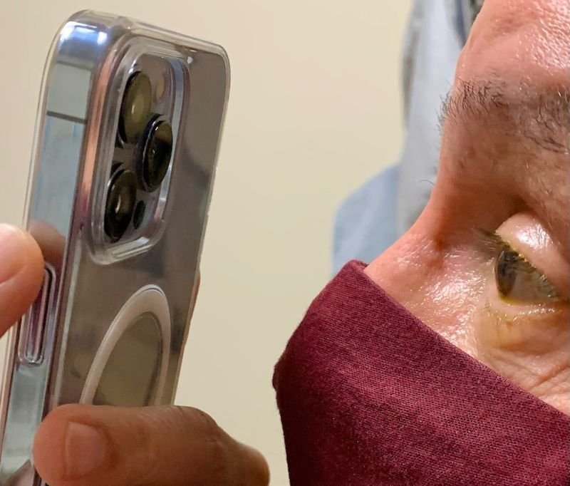 Dr. Korn ได้แชร์รูปภาพการใช้งาน iPhone 13 Pro Max ระหว่างถ่ายภาพหนึ่งในคนไข้ที่เพิ่งผ่านการผ่าตัดปลูกถ่ายกระจกตา ซึ่งเขาถ่ายภาพดวงตาเพื่อตรวจสอบการฟื้นฟูหลังการรักษา