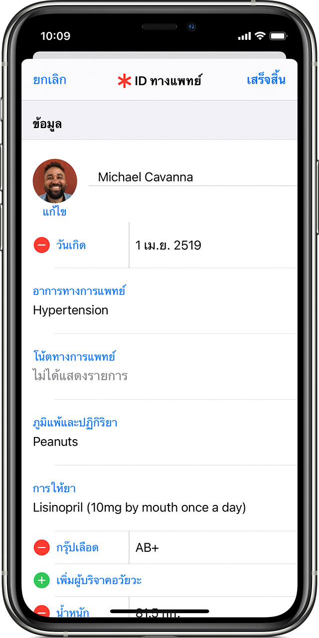 ที่อยู่ถัดจากรายชื่อ แล้วแตะลบ - หากต้องการทำให้ ID ทางแพทย์ใช้งานได้จากหน้าจอล็อค ให้เปิดแสดงขณะล็อคอยู่ ในกรณีฉุกเฉิน ID ทางแพทย์นี้จะมอบข้อมูลกับคนที่ต้องการช่วยหากต้องการแชร์ ID ทางการแพทย์ของคุณกับผู้ที่มาช่วยเหลือ ให้เปิดแชร์ในระหว่างโทรฉุกเฉิน เมื่อคุณโทรหรือส่งข้อความไปยังบริการฉุกเฉินใน iPhone หรือ Apple Watch นั้น ID ทางแพทย์ของคุณจะถูกแชร์โดยอัตโนมัติเมื่อใช้บริการฉุกเฉิน*