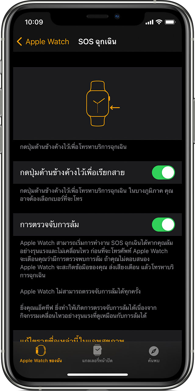 *Apple Watch ไม่สามารถตรวจจับการล้มได้ทุกครั้ง ยิ่งคุณเคลื่อนไหวร่างกายมากเท่าใดก็จะยิ่งกระตุ้นการตรวจจับการล้มมากเท่านั้น เนื่องจากกิจกรรมที่มีแรงกระแทกสูงอาจถูกตรวจจับว่าเป็นการล้มได้