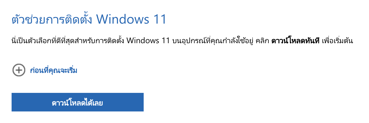 ดาวน์โหลดตัวติดตั้งจากเว็บไซต์ Microsoft ได้ที่ https://www.microsoft.com/en-us/software-download/windows11 หรือพิมพ์ Search ใน Google ว่า Windows 11 Download แล้วคลิ๊กที่ ตัวช่วยการติดตั้ง Windows 11 หรือ Windows 11 Installation Assistant