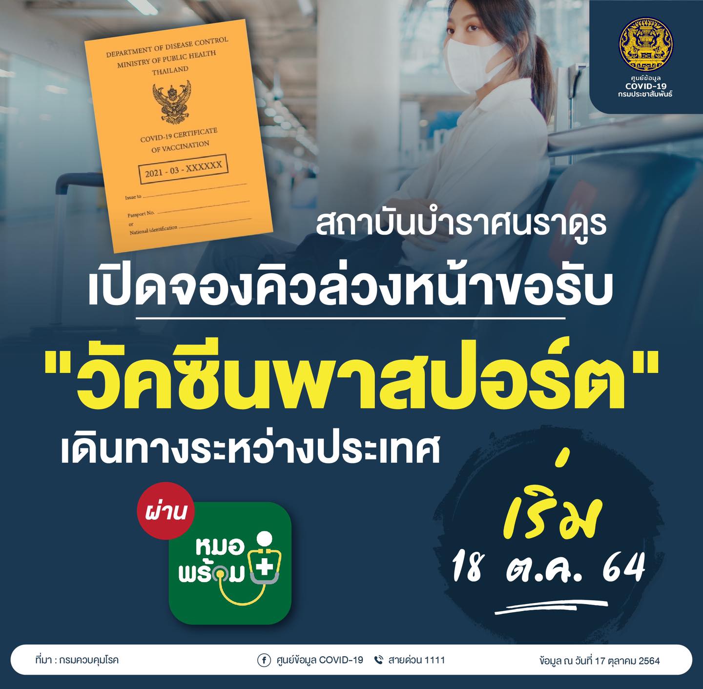 ใครที่ฉีกวัคซีนครบโดสแล้วอยากจะเดินทางไปต่างประเทศ ตอนนี้ทางสถาบันบำราศนราดูรเปิดให้ประชาชนสามารถจองคิวเพื่อเข้ามาทำวัคซีนพาสปอร์ต ผ่าน แอปพลิเคชัน “หมอพร้อม” เริ่มจองล่วงหน้าได้ตั้งแต่ 18 ตุลาคม 2564
