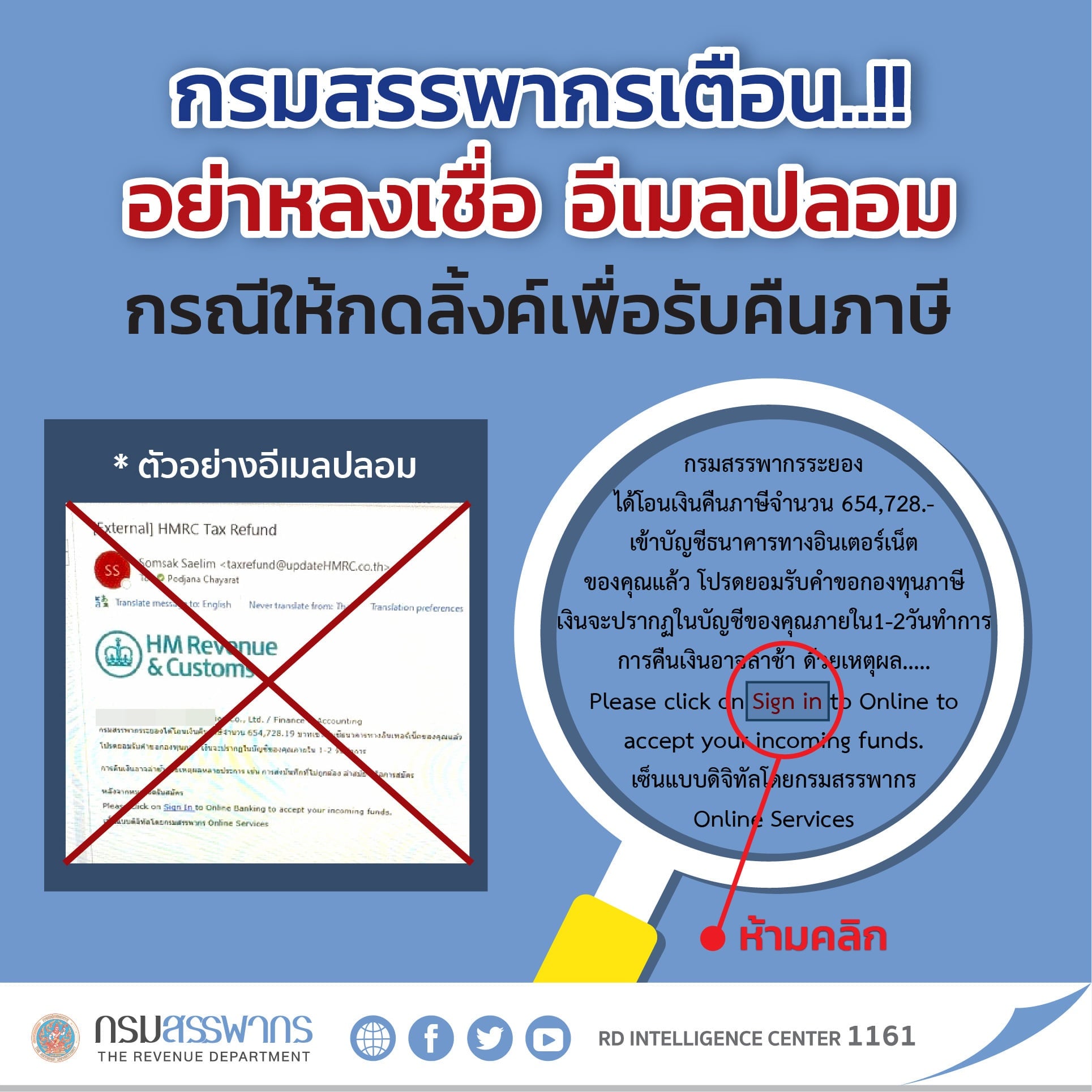 ทางกรมสรรพากรขอยืนยันว่าอีเมลดังกล่าวเป็นอีเมลปลอม โปรดอย่าหลงเชื่อและทำตามเป็นอันขาด ซึ่งอาจจะทำให้ท่านสูญเสียทรัพย์สินหรือเกิดความเสียหายได้ หากมีข้อสงสัยสามารถสอบถามรายละเอียดเพิ่มเติม ได้ที่ส านักงานสรรพากรทุกแห่งทั่วประเทศหรือศูนย์สารนิเทศสรรพากร (RD Intelligence Center) โทร. ๑๑๖๑”