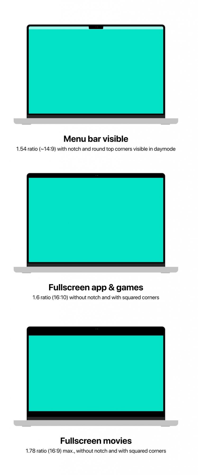 ตัวแทนจาก Apple ให้สัมภาษณ์กับสื่อว่า รอยบากบน MacBook Pro ที่ออกแบบใหม่เป็นนั้นก็เพื่อให้ผู้ใช้มีพื้นที่จอมากขึ้น โดย MacBook Pro ใหม่ทั้งสองขนาดจะมีหน้าจอที่ใหญ่ขึ้นกว่าชื่อรุ่นถึง 0.2 นิ้ว อย่างรุ่น 14 นิ้วจะได้จอ 14.2 นิ้ว และ รุ่น 16 นิ้วจะได้จอถึง 16.2 นิ้ว