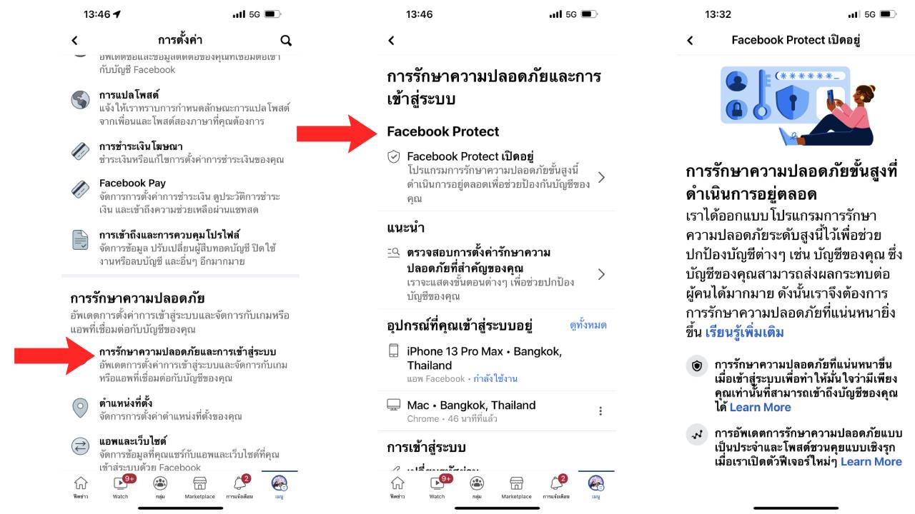 มองหาหัวข้อการตั้งค่าและความเป็นส่วนตัว เลือกที่ การตั้งค่า จากนั้นมองหารหัสผ่านและความปลอดภัย เลือกที่ Facebook Protect ตั้งค่าตามที่ระบบกำหนด เช่น ตั้งรหัสผ่ารที่เดายาก, การยืนยันตัวตน 2 ชั้น และการแจ้งเตือนเข้าระบบเมื่อเข้าใช้งานจากอุปกรณ์อื่นๆ