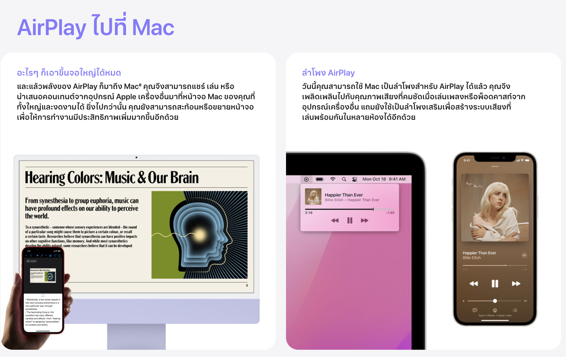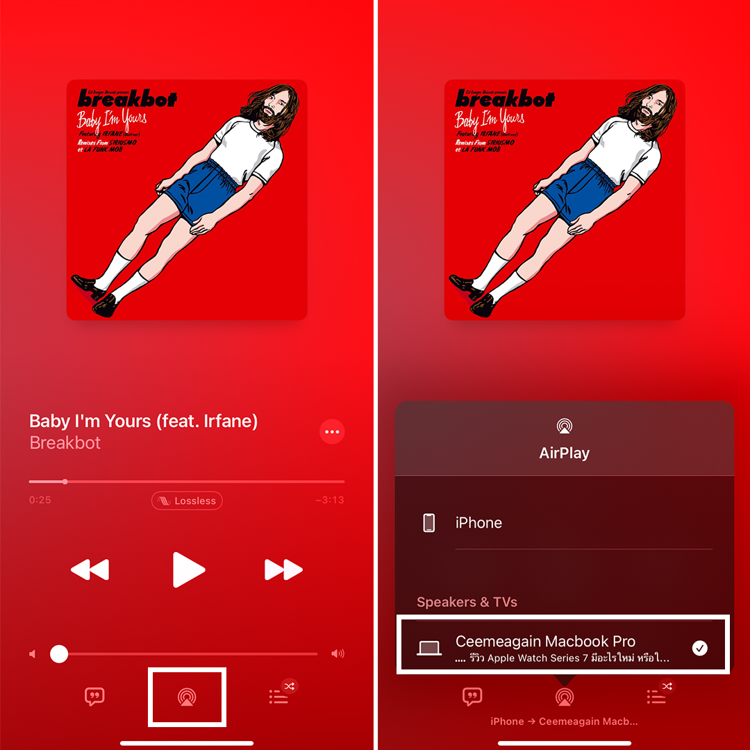 ตัวอย่างการ AirPlay to Mac ผ่าน Apple Music: เปิดแอป > แตะไอคอน AirPlay > เลือก Mac เครื่องปลายทางจะใช้เล่นเพลง