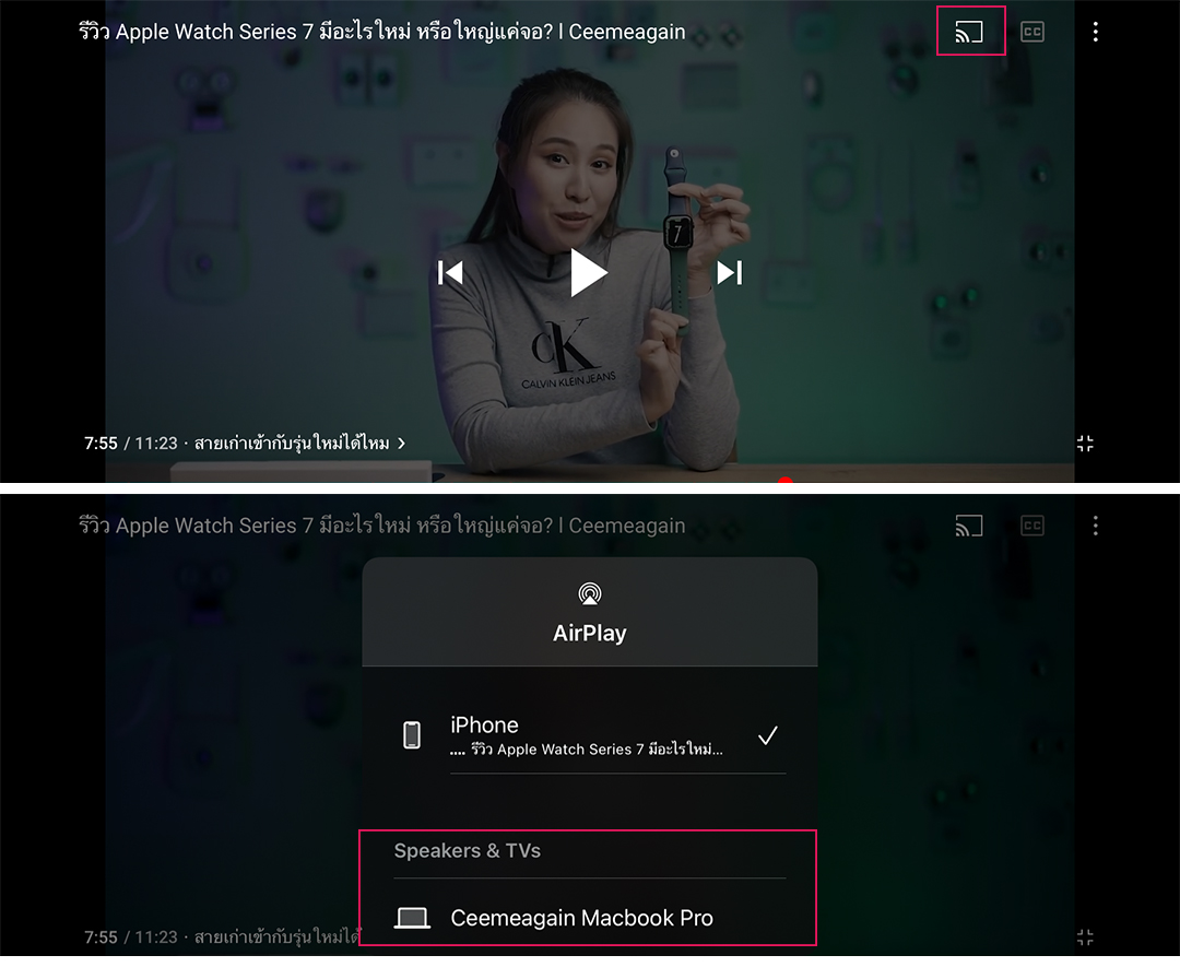 หรือถ้าฝั่งของแอป YouTube ก็คลิกที่ ปุ่ม Airplay ด้านบนแล้วเลือก MacBook ได้เลย