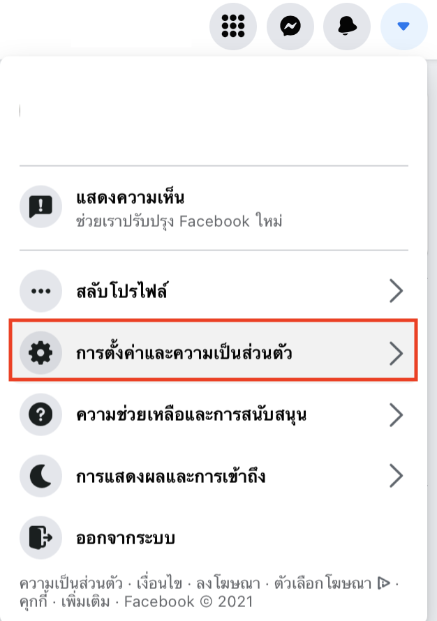 1.เข้าเฟสบุ๊คของเราผ่านเว็บเบราว์เซอร์ แล้วไปที่การตั้งค่าและความเป็นส่วนตัว