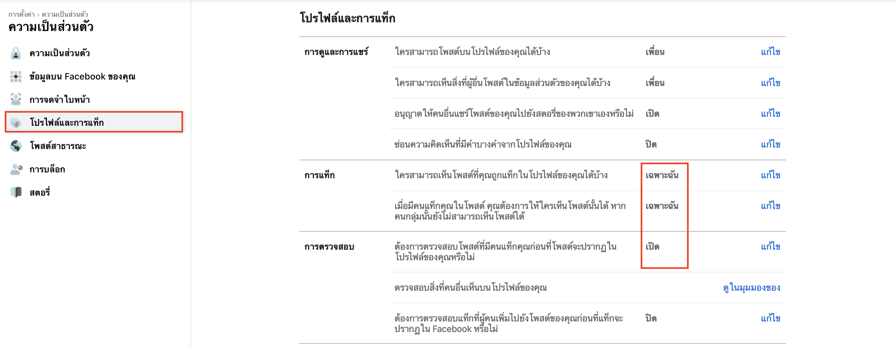 4.เลือก ‘โปรไฟล์และการแท็ก’ แล้วดูที่ ‘การแท็ก’ ให้เปลี่ยนเป็น ‘เฉพาะฉัน’ ไม่ว่าใครแท็กรูปอะไรมาก็จะไม่ปรากฏบนหน้าโปรไฟล์เรา แล้วถ้าเราอยากตรวจสอบการแท็กก่อน ให้เลือกเป็น ‘เปิด’