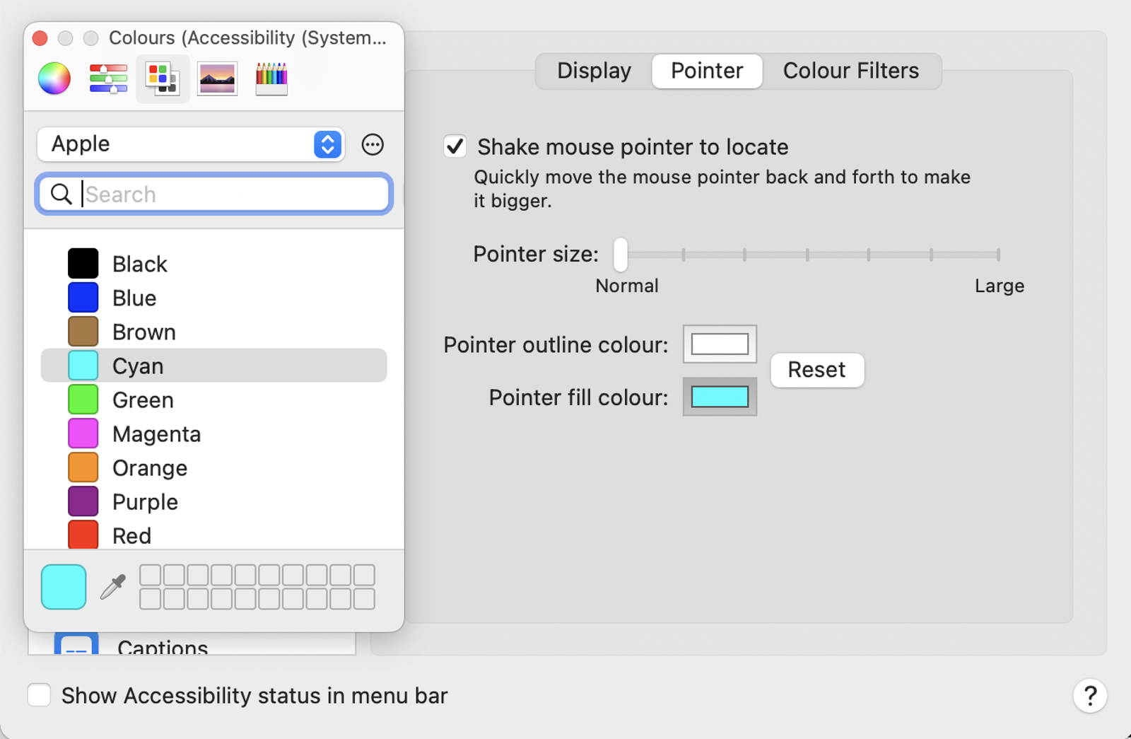 ใน macOS Monterey เปิดให้เราปรับแต่งสีสันของเคอร์เซอร์เมาส์ได้แล้ว ให้เราเข้าไปที่ System Preferences > Accessibility > Vision > Display > Pointer.