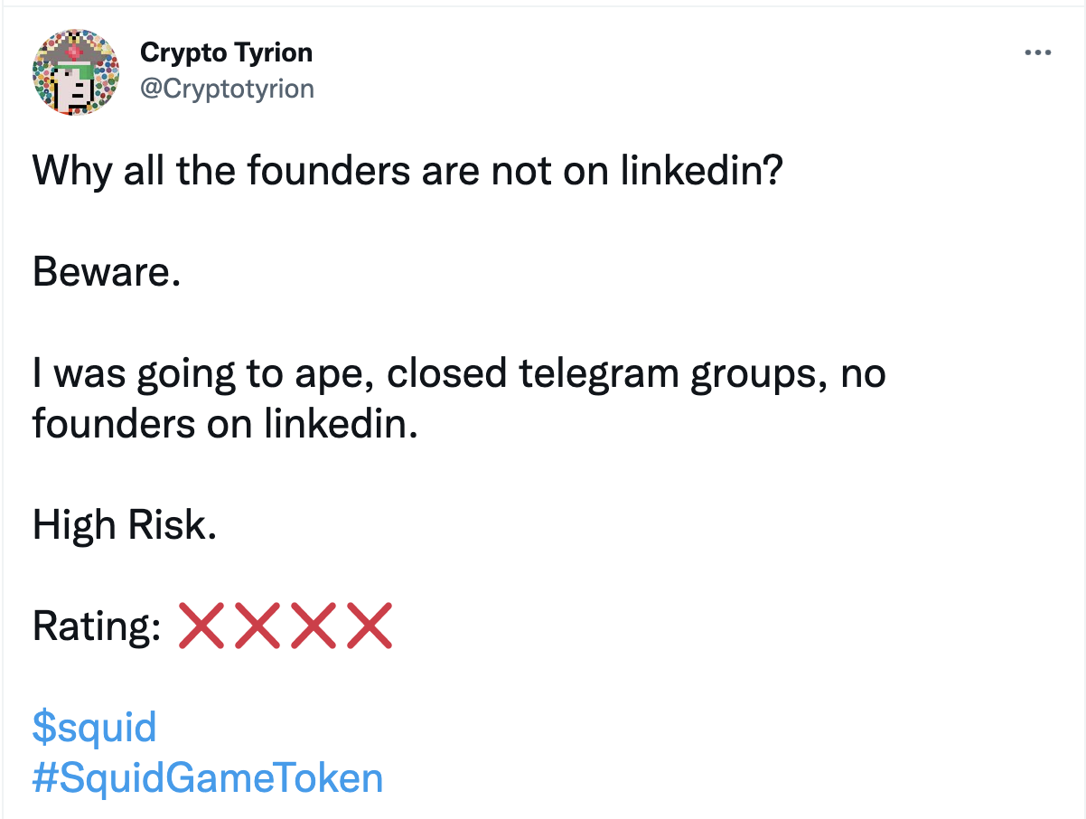 “Crypto Tyrion” แอคเค้าท์ Twitter รายนึงออกมาเตือนนักลงทุนว่าผู้ก่อตั้งนั้นดูน่าสงสัย ซึ่งบอกว่าชื่อของผู้ก่อตั้งนั้นไม่ได้อยู่ใน และยังเน้นว่า Squid Token มีการบล็อกไม่ให้แสดงความคิดเห็นบน Twitter ซึ่งเค้าเชื่อว่า “rug pull 100% ”