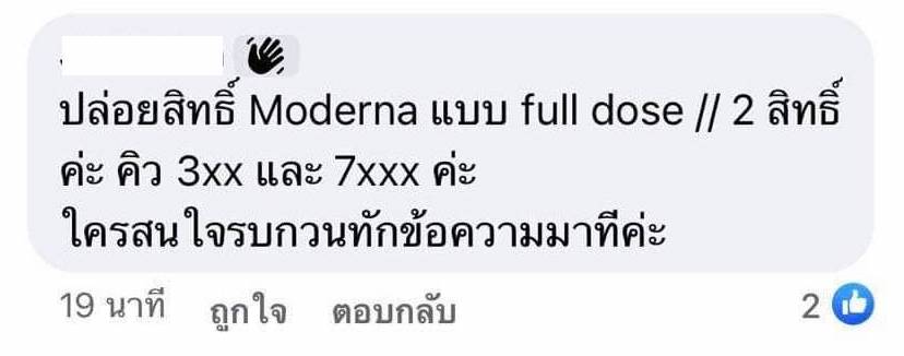 หลังจากที่วัคซีนโมเดอนาล็อตแรกส่งถึงไทยแล้ว แต่ปัญหาคือมีจำนวนแค่ 10% ของยอดสั่งซื้อทั้งหมด และยังไม่มีความชัดเจนว่าล็อตต่อไปจะเข้ามาได้เมื่อไหร่ ทำให้หลายคนต้องการรีบฉีดวัคซีนภายในเดือนนี้ รวมถึงคนที่ฉีดวัคซีนอื่นไปแล้วไม่สามารถขอคืนเงินได้ แต่ทางโรงพยาบาลอนุญาตให้ผู้ที่สั่งไว้แล้วสามารถโอนสิทธิ์ฉีดวัคซีนได้ จึงทำให้เกิดการขายคิวขึ้นมา