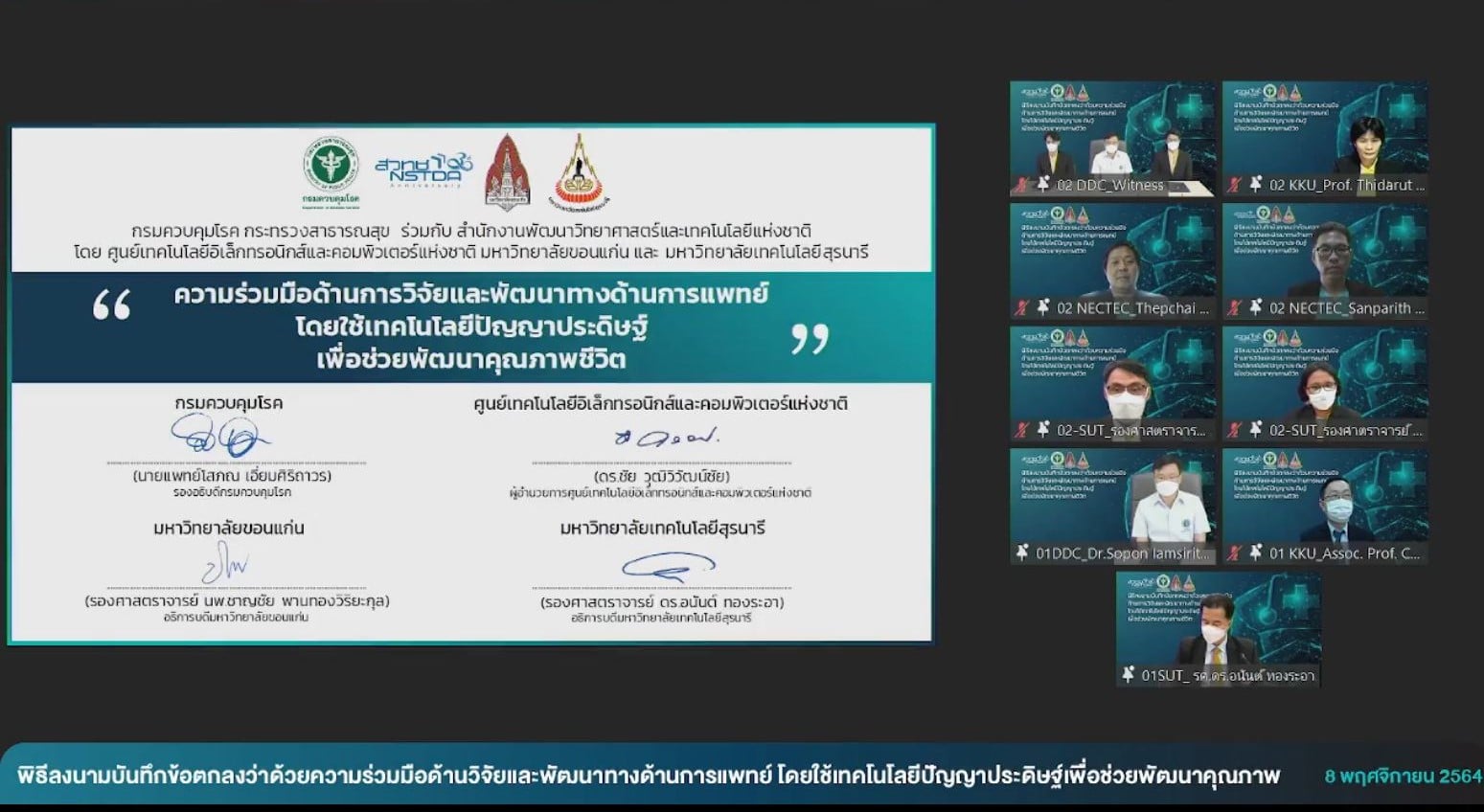 ความร่วมมือด้านการวิจัยและพัฒนาทางด้านการแพทย์ โดยใช้เทคโนโลยีปัญญาประดิษฐ์ (Artificial Intelligence หรือ AI) เพื่อช่วยพัฒนาคุณภาพชีวิต ระหว่าง 4 หน่วยงาน คือ กรมควบคุมโรค สวทช. มข. และ มทส.ในครั้งนี้ ถือเป็นอีกหนึ่งความร่วมมือด้านนวัตกรรมทางการแพทย์และสาธารณสุข ในการพัฒนาการตรวจคัดกรองและวินิจฉัยโรคพยาธิใบไม้ตับและหนอนพยาธิ ซึ่งเป็นโรคติดต่อที่เป็นปัญหาสาธารณสุขที่สำคัญของประเทศไทย โดยใช้ AI เข้ามาช่วยตรวจวินิจฉัยได้อย่างสะดวก รวดเร็ว และแม่นยำ สนับสนุนการทำงานของเจ้าหน้าที่การแพทย์ เพื่อให้การรักษาพยาบาลที่ถูกต้อง ลดโอกาสความเสี่ยงต่อการเกิดโรคมะเร็งท่อน้ำดีและมะเร็งตับ มุ่งยกระดับคุณภาพชีวิตและสุขภาพที่ดีของประชาชน