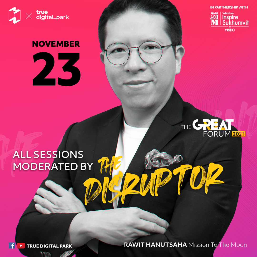 ใครที่อยากมาร่วมปรับมุมมองความคิด เปลี่ยนเป็นพลังบวก สร้างสรรค์สิ่งดี ๆ ให้กับตัวเองและสังคม กับ 6 นักสร้างสรรค์ผู้สร้างความเปลี่ยนแปลงทางสังคม สามารถติดตามฟอรัมออนไลน์ THE GREAT FORUM 2021 ในธีม The Great Mind in Crisis ในวันที่ 24 พฤศจิกายน 2564 รับชมฟรีได้ตั้งแต่เวลา 16.00 น. เป็นต้นไป ผ่านทาง Facebook และ YouTube ของ True Digital Park