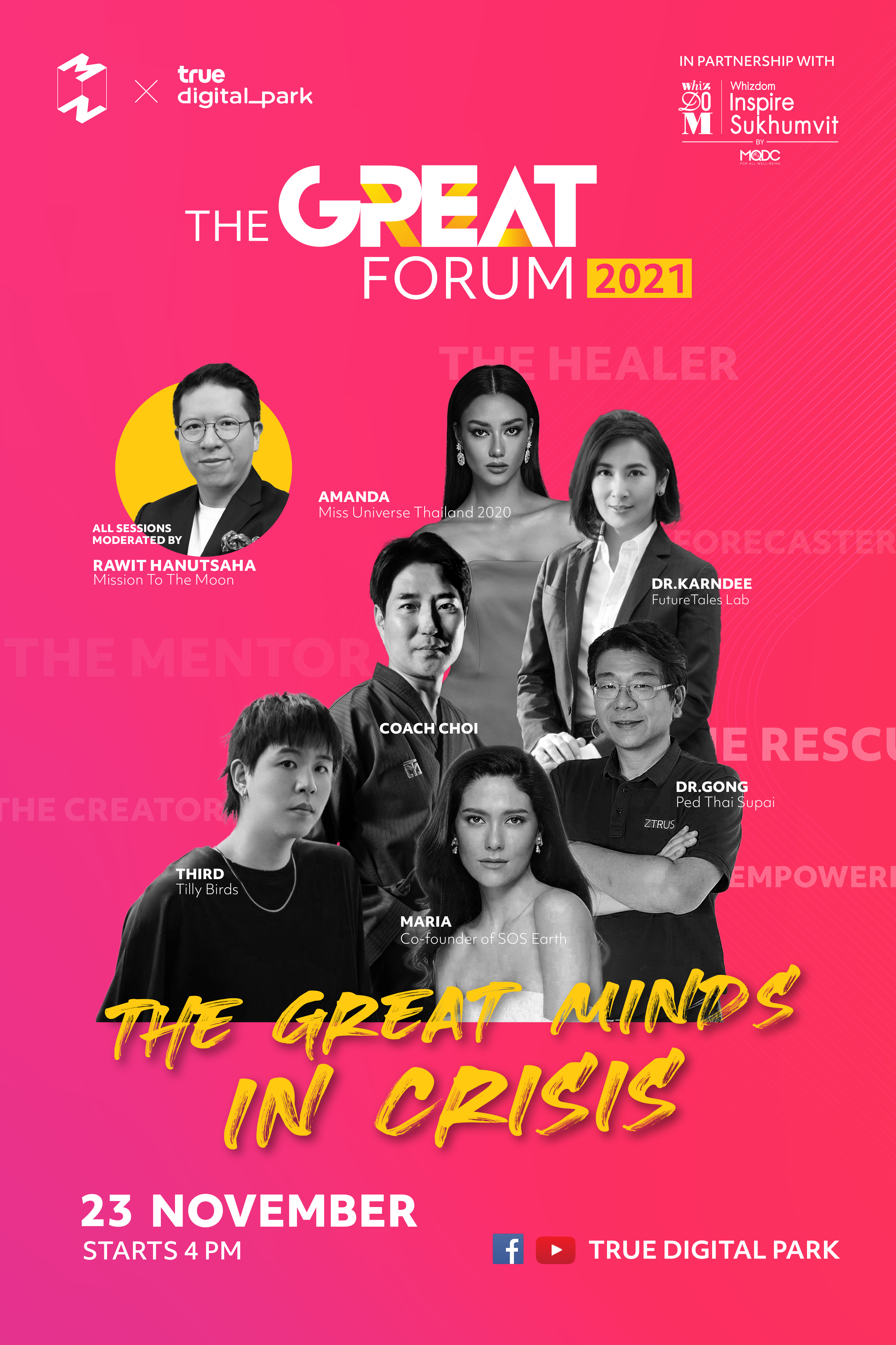 ความเชื่อและวิธีคิดสามารถเรียนรู้และเปลี่ยนแปลงได้ คนอื่นทำได้ คุณเองก็ทำได้เหมือนกัน เพียงแค่ต้องกล้าที่จะเริ่มก่อน ก้าวต่อไปจะง่ายขึ้น ใครที่ต้องการปรับมุมมองตัวเองใหม่ ห้ามพลาดเลยค่ะ กับฟอรัมออนไลน์แห่งปี THE GREAT FORUM 2021: The Great Mind in Crisis ที่ทางทรูดิจิทัลพาร์ค จับมือ Mission To The Moon ร่วมกับโครงการ วิสซ์ดอม อินสปาย สุขุมวิท โดย MQDC ผู้ดำเนินธุรกิจการพัฒนา ลงทุน และจัดการอสังหาริมทรัพย์ ประกอบด้วย บ้าน คอนโดมิเนียม โครงการคอมมูนิตี้ ดิสทริค และธีมโปรเจกต์ รวมถึงธุรกิจค้าปลีก และโรงแรม พร้อมดำเนินธุรกิจภายใต้คำมั่นสัญญา “For All Well-Beingร่วมกันชักชวน 6 นักสร้างสรรค์รุ่นใหม่ มาชวนคุณปรับแนวคิด สร้างพลังบวกในการรับมือกับวิกฤตที่ถาโถมเข้ามา