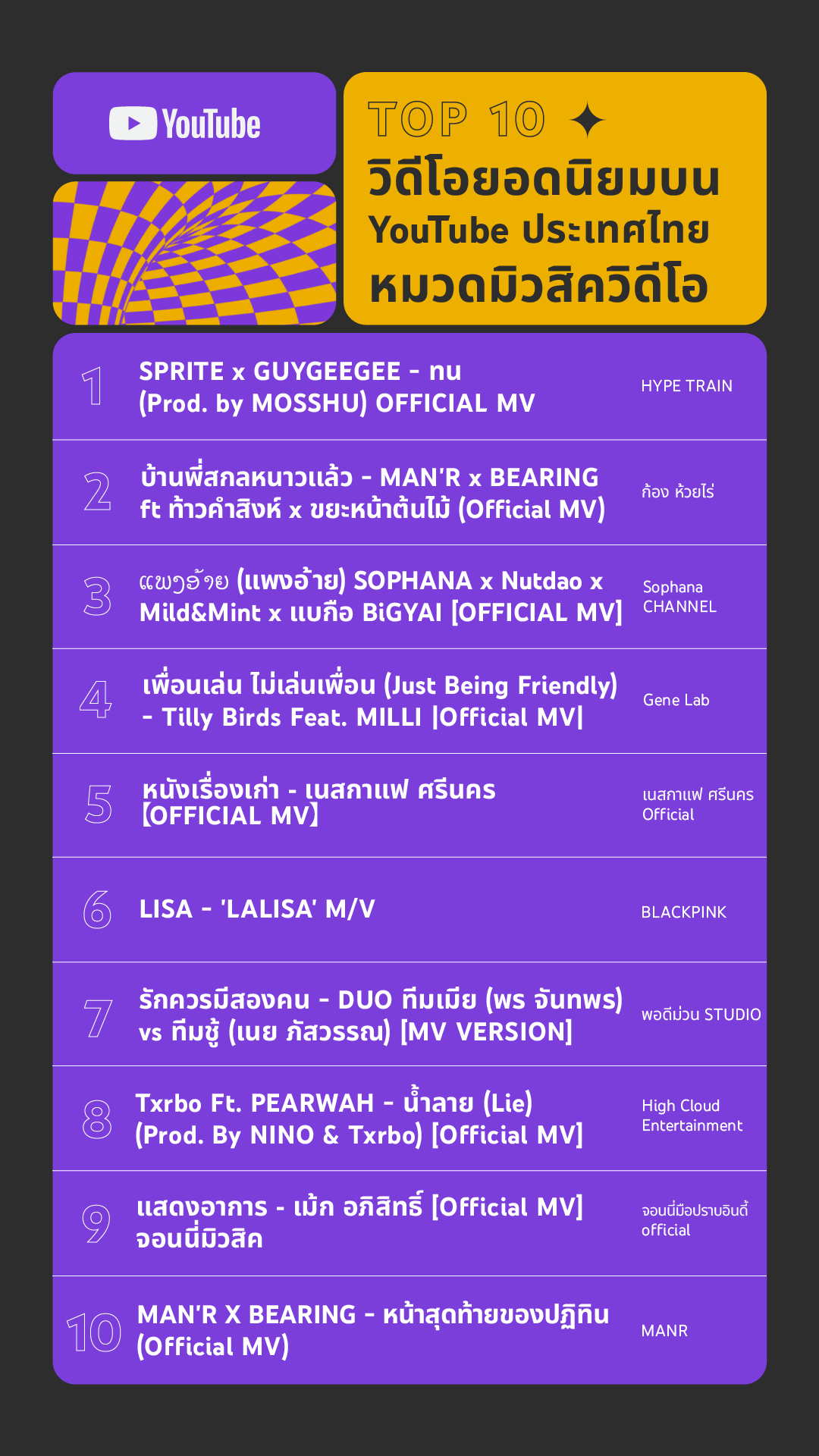 10 อันดับวิดีโอยอดนิยมบน YouTube ประเทศไทย หมวดมิวสิควิดีโอ (จัดอันดับในเดือนพฤศจิกายน 2564)