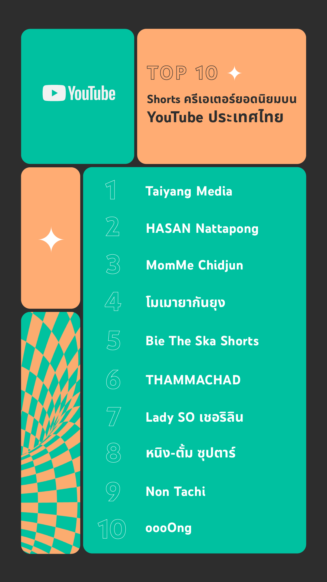 ส่งท้ายด้วยหมวดพิเศษในปีนี้คือ Shorts ครีเอเตอร์ยอดนิยม อันดับ 1 ได้แก่ช่อง Taiyang Media กับละครสั้นสอนใจ อันดับ 2 คือช่อง HASAN Nattapong อันดับ 3 เป็นช่อง MomMe Chidjun ของพลอย ชิดจันทร์ ส่วนช่อง โมเมายากันยุง และ Bie The Ska Shorts คว้าอันดับ 4 และ 5 ตามลำดับ