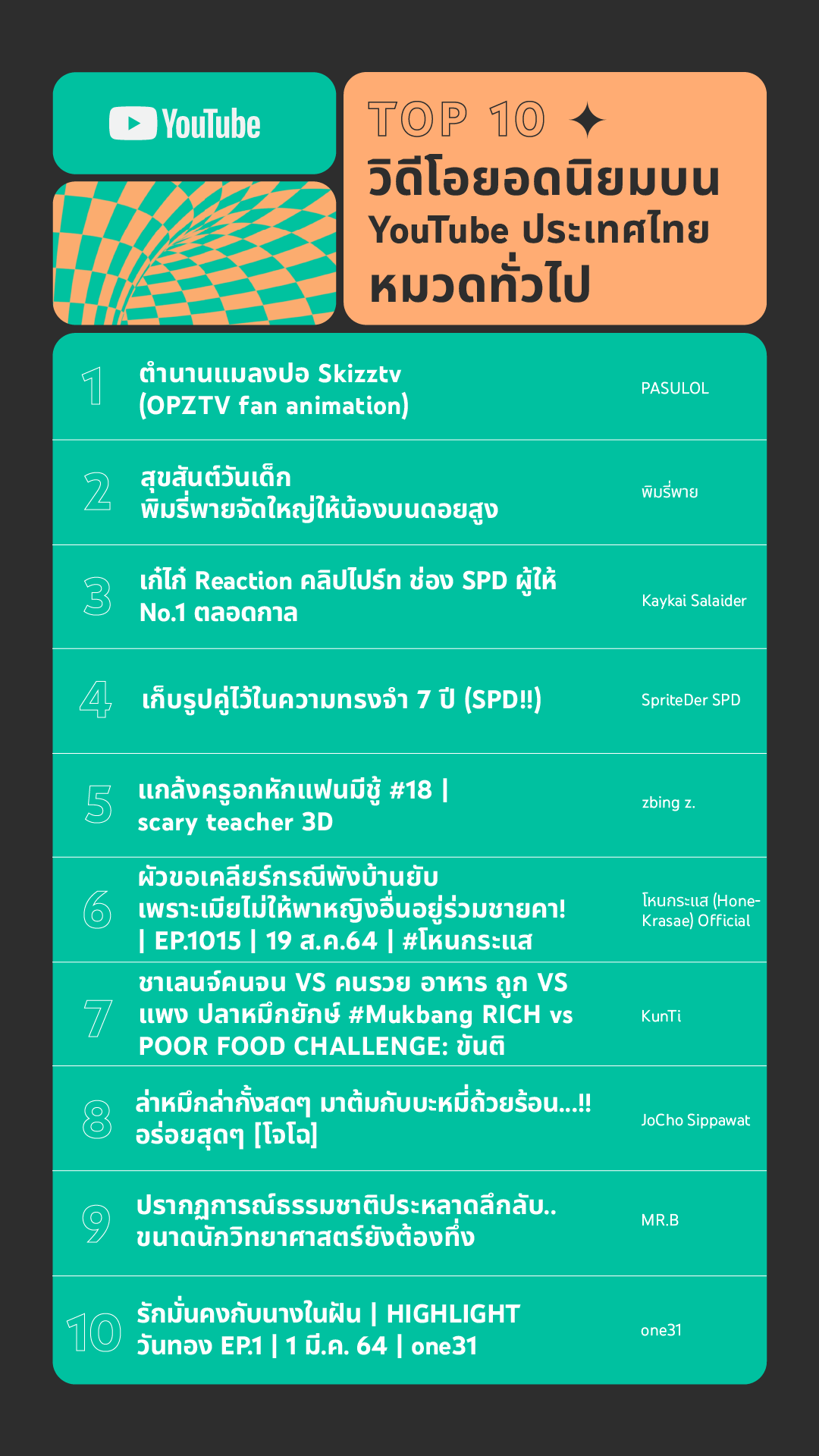 10 อันดับวิดีโอยอดนิยมบน YouTube ประเทศไทย หมวดทั่วไป (จัดอันดับในเดือนพฤศจิกายน 2564)