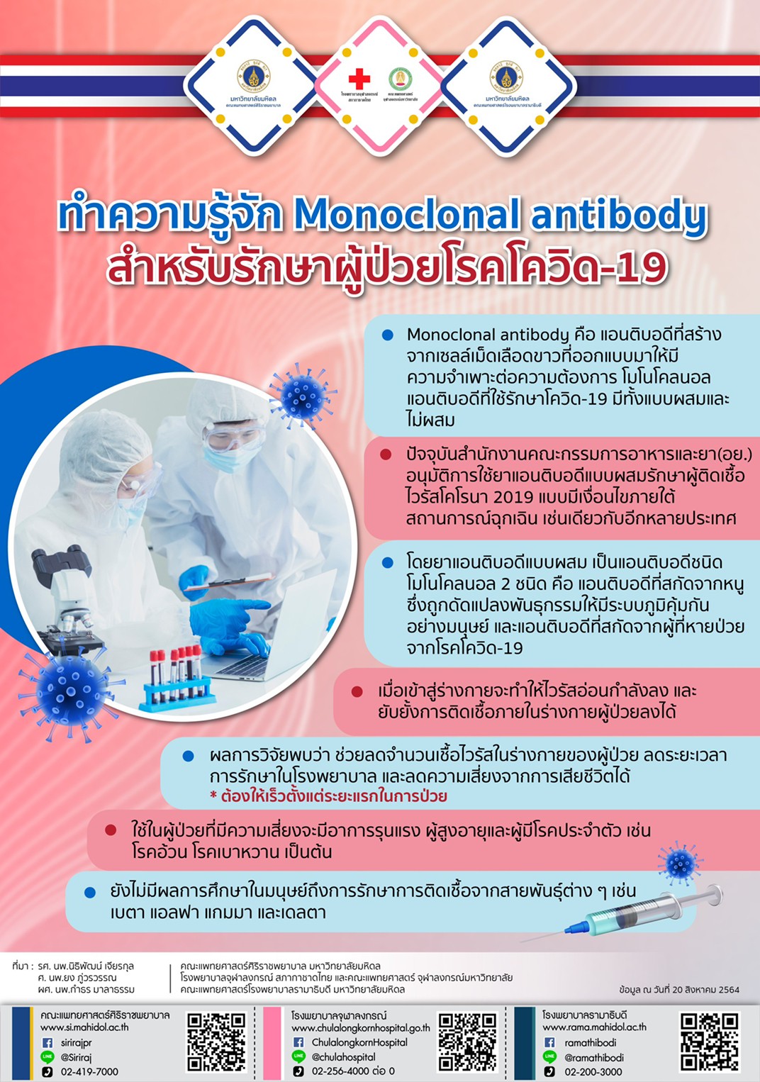 - Monoclonal antibody คือ แอนติบอดีที่สร้างจากเซลล์เม็ดเลือดขาวที่ออกแบบมาให้มีความจำเพาะต่อความต้องการโมโนโคลนอลแอนติบอดีที่ใช้รักษาโควิด-19 มีทั้งแบบผสมและไม่ผสม
