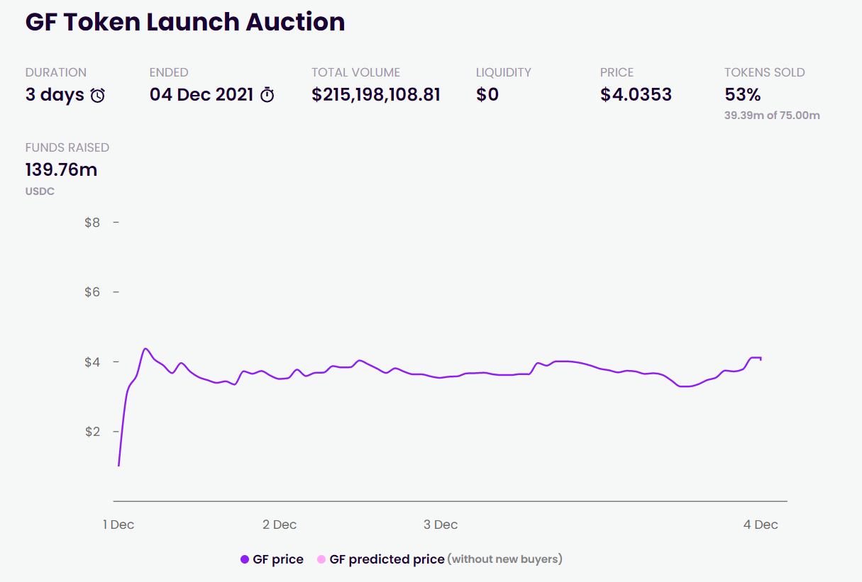 GuildFi ได้เงินทุนไปกว่า 140 ล้านดอลลาร์ ตีเป็นเงินไทยกว่า 4,700 ล้านบาทหลังเปิดระดมทุนแค่ 3 วันผ่านการประมูลโทเคน GF บนแพลตฟอร์ม Copper Launch โดยราคาจะลดต่ำลงจากราคาเปิดประมูลเรื่อย ๆ ถ้าไม่มีคนซื้อ แต่โทเคน GF ของ GuildFi นั้นได้รับความสนใจจากนักลงทุนเป็นอย่างมากเลยทำให้ราคาแทบไม่ลดลงเลยจนปิดประมูลไปที่ราคา 4.03 ดอลลาร์