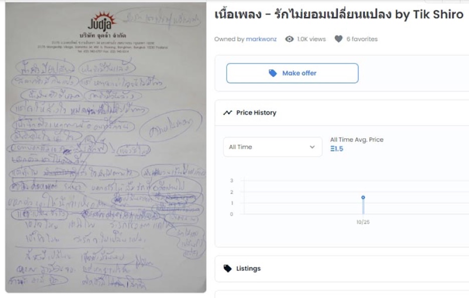 ของไทยเราก็มีอย่างเช่น เนื้อเพลง “รักไม่ยอมเปลี่ยนแปลง” ของติ๊ก ชีโร่ ขายไปได้ประมาณ 2 แสนบาท