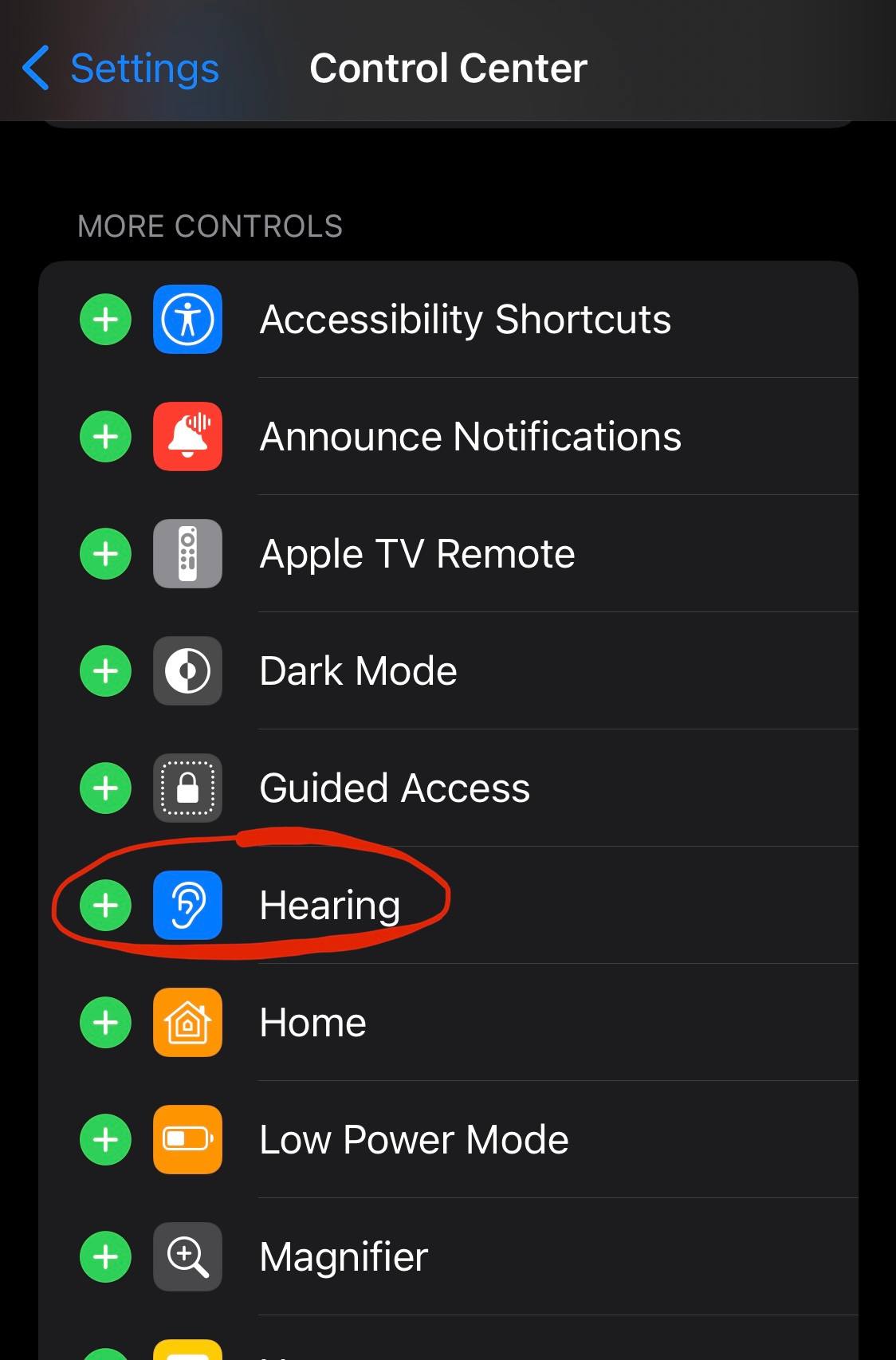 • เลือนลงมากดเครื่องหมาย + เพื่อเพิ่ม Hearing เข้าสู่แผง Control Center (ศูนย์ควบคุม) ของเรา